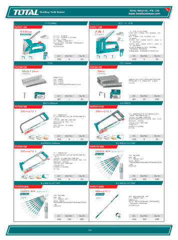 www.totalbusiness.comTOTAL TOOLS CO., PTE. LTD.www.totaltools.cn 01Unit Qty/Pack Qty/CtnPCS 100 500雙金屬鋸條/12\THT571246材質:M42+D6A 齒數:24T 尺寸:300mm(12“) 100Pcs / 盒 適用於:鋼鋸架 THT541026 / THT541036 / THT54166 / THT54106 採用塑膠盒包裝Unit Qty/Pack Qty/CtnPCS 100 500雙金屬鋸條/12\THT572328材質:M2+D6A 齒數:32T 尺寸:300mm(12”) 適用於:鋼鋸架 THT541026/THT541036/THT54166/THT54106 塑膠盒包裝Unit Qty/Pack Qty/CtnPCS 100 500雙金屬鋸條/12\THT572188材質:M2+D6A 齒數:18T 尺寸:300mm(12”) 適用於:鋼鋸架THT541026/THT541036/THT54166/THT54106 塑膠盒包裝Unit Qty/Pack Qty/CtnPCS 6 24鋁柄鋼鋸架/300mmTHT54106尺寸:300mm/12\附 1 個 300 mm (12\屬刀片 手柄材質:鋁 +ABS 塑膠 +TPR 塑膠 獨特設計工業鋼鋸架適用於切割金屬、塑膠、木材 軟握把設計,堅固舒適 可調式鋸片角度:45°和 90° 可調式鋸片張力 快速釋放刀片更換機制 紙卡包裝Unit Qty/Pack Qty/CtnPCS 6 2412吋鋼鋸架THT541016尺寸:300mm/12\24TPI、M2+D6A 雙金屬刀片 手柄材質:鋁 +ABS +TPR 塑膠 獨特設計的鋼鋸架適用於切割金屬、塑膠、木材等 軟握把設計,堅固舒適 可調式鋸片角度:45°和 90° 可調鋸片張力 快速釋放刀片更換機制 紙卡包裝Unit Qty/Pack Qty/CtnPCS 6 24鋼鋸架/300mmTHT54166尺寸:300mm/12\附 1 個 300 mm (12\屬刀片 手柄材質:ABS 塑膠 +TPR 塑膠 適用於切割金屬、塑膠、木材 軟握把設計 舒適、易於使用、輕巧的鋼鋸 紙卡包裝Unit Qty/Pack Qty/CtnSET 20 200門釘-10mmTHT391021000 個訂書針(適用於 THT31142/THT31143、 THT31146)尺寸:10mm 寬度:1.2mm 彩盒包裝Unit Qty/Pack Qty/CtnSET 1 40T型釘THT391055000/ 彩色盒 長度:10mm 頭部:2.0mm 寬度:1.2mm 適用於 THT31143\\THT31146 彩盒包裝Unit Qty/Pack Qty/CtnPCS 5 20輕型二合一釘槍THT31146二合一釘槍 高 / 低功率開關 訂書針:線材:1.2mm,冠部:10.6mm,長度:6-14mm 線材:1.2mm,冠部:11.3mm,長度:6-14mm 布拉德釘:線材:1.2mm,頭部尺寸:2mm,長度:10-15mm 布拉德釘:線材:1.2mm,頭部尺寸:2mm,長度:10-15mm 布拉德釘與 Staple 商品搭配:THT3982、THT39102、THT39122 和 Brad Nails:THT39105 採用雙泡罩包裝Unit Qty/Pack Qty/CtnPCS 5 20手釘槍/800gTHT31142釘子尺寸:4-14mm 釘子外徑:10.6mm 或 11.3mm 釘子寬度:1.2mm 重量:800g 含 1000 個釘子 與主打產品搭配:THT3982、THT39102 和THT39122 採用雙泡罩包裝100
