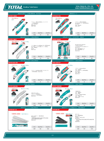 www.totalbusiness.comTOTAL TOOLS CO., PTE. LTD.www.totaltools.cn 01Unit Qty/Pack Qty/CtnSET 20 12018mm美工刀刀片SK4/黑刃,18x100mmTHTCB18110 件 / 套 尺寸:18X100mm SK4 鋼刀片 表面處理:高溫回火黑色 適用於產品THT511816/THT511826/THT511836/TG5121806 雙泡罩包裝Unit Qty/Pack Qty/CtnSET 20 12018mm美工刀刀片/18x100mmTHT51911210 件 / 套裝尺寸:18X100mm 適用於產品THT511816/THT511826/THT511836/ TG5121806/THT511815 塑膠盒包裝Unit Qty/Pack Qty/CtnPCS 12 72不銹鋼摺疊快背美工刀/61*19mmTHT5136288不鏽鋼折疊刀 长度:180mm 淨重:165g 刀片尺寸:61mm*19mm 含 6 片 SK5 刀片 材質:不鏽鋼、鋁合金 雙泡罩包裝Unit Qty/Pack Qty/CtnPCS 12 72折疊刀/61*19mmTHT5136236折疊刀鋁合金手柄 刀片尺寸:61x19mm, 含 5 片刀片(THT519001), 雙泡罩包裝Unit Qty/Pack Qty/CtnPCS 6 48不銹鋼推式快背美工刀/61x19mmTG5126101刀刃尺寸:61mmx19mm 長度:175mm 含 6 片 SK5 刀片(THT519001) 鋅合金本體 淨重:256 克 雙泡罩包裝Unit Qty/Pack Qty/CtnPCS 6 72梯形刃鋁合金重型刀/61x19mmTHT5126128刀片尺寸:61x19mm SK5 刀片含 6 片刀片 (THT519001)雙泡罩包裝Unit Qty/Pack Qty/CtnSET 8 4822Pcs鋁合金美工刀組套/梯形,18mmTHT51522622 件組多用途刀套裝包括: 1 把鋁合金多用途刀 1 把 18 毫米鋁合金可折斷刀片刀 鋁合金刀身 10 片 18x100mm 刀片 10 片 61x19mm 刀片 雙泡罩包裝Unit Qty/Pack Qty/CtnPCS 12 14418mm鋁合金美工刀/18x100mmTHT511807刀片:18mm(長)x100mm(寬)(THT519112) 鋁合金機身,附 1 個 SK4 刀片,自動鎖定 長度:152mm 附平鈕 滑動卡包裝Unit Qty/Pack Qty/CtnPCS 12 9618mm美工刀THT522136刀片尺寸:18mmx100mm, 附 3 個 SK4 刀片(THT519112), 附平按鈕 長度:167mm 滑動卡包裝Unit Qty/Pack Qty/CtnPCS 12 9618mm包膠美工刀/18x100mm,圓形旋鈕THT511826刀片尺寸:18mmx100mm,含 1 片刀片(THT519112) 長度:173 毫米 附圓形按鈕 滑動卡包裝102