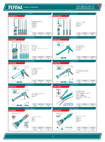www.totalbusiness.comTOTAL TOOLS CO., PTE. LTD.www.totaltools.cn 01Unit Qty/Pack Qty/CtnPCS 12 120膠柄批刀/60mmTHT683606尺寸:63 毫米(2.5 吋) 鋁頭端 不銹鋼熱處理 精細拋光 雙色塑膠手柄 標籤包裝Unit Qty/Pack Qty/CtnPCS 12 120開發柄批刀/60mmTHT83606尺寸:60 毫米(2.5 吋) 不銹鋼 熱處理 精細拋光 標籤包裝Unit Qty/Pack Qty/CtnPCS 1 10黃油槍/400CCTHT111051重型奶油槍 台灣品質 容量:400CC / 14oz 裝填方式:14Oz 筒裝 / 400CC 散裝 工作壓力:4500psi 爆破壓力:10000psi 材質:1.2mm 鋼管 + 鑄鋁 標準配件:1 個 12 吋高壓柔性尼龍管 1 個金屬彎嘴 彩盒包裝Unit Qty/Pack Qty/CtnPCS 4 16鋁管壓膠槍/12\THT2011212 吋鋁製填縫槍 堅固的鋁製手柄 長度:300 毫米 直徑:51 毫米 標籤包裝Unit Qty/Pack Qty/CtnPCS 4 16鋁管壓膠槍/9\THT201099 吋鋁製填縫槍 堅固的鋁製手柄 長度:230 毫米 直徑:51 毫米 標籤包裝Unit Qty/Pack Qty/CtnPCS 12 249吋旋轉式壓膠槍THT215099 吋填縫槍 堅固的鋁製手柄 具有旋轉功能 厚度:1.8mm 長度:230mm 直徑:55mm 光桿:8.0mm 紙卡包裝Unit Qty/Pack Qty/CtnPCS 12 24矽利康槍/9\THT218099 吋壓膠槍 鐵柄帶齒 長度:230 毫米(9 吋) 厚度:0.8 毫米 直徑:55 毫米 按標籤包裝Unit Qty/Pack Qty/CtnSET 12 72小銼刀組套/6PCSTHT914626 件組銼刀 长度:140 毫米 直径:3 毫米 扁平、圆形、半圆形、方形、三角形、刀形 带双色手柄 双泡罩包装Unit Qty/Pack Qty/CtnSET 10 203件式木銼刀THT918326木材加工尺寸:200mm 扁平木銼 1 件 半圓形木銼 1 件 圓形木銼 1 件 雙泡罩包裝Unit Qty/Pack Qty/CtnSET 5 105件式鋼銼刀THT918516適用於金屬長度:200mm, T12 鋼扁平鋼銼 1 件 半圓鋼銼 1 件 圓形鋼銼 1 件 三角鋼銼 1 件 方形鋼銼 1 件 雙泡罩包裝105