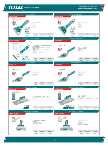 www.totalbusiness.comTOTAL TOOLS CO., PTE. LTD.www.totaltools.cn 01Unit Qty/Pack Qty/CtnPCS 10 60薄柄不鏽鋼介刀/250mmTHPUT78250尺寸:10 吋 /250 毫米 不鏽鋼刀片 強化鋁型材 刀片厚度:0.5 毫米 獨特設計手柄,標籤包裝Unit Qty/Pack Qty/CtnPCS 10 60薄柄不鏽鋼介刀/200mmTHPUT78200尺寸:8 吋 /200 毫米不鏽鋼刀片 強化鋁型材 刀片厚度:0.5 毫米 獨特設計手柄,標籤包裝Unit Qty/Pack Qty/CtnPCS 10 40帶齒抹泥刀/280*130mmTHTT81286尺寸:280x130mm 齒數:10*10mm 刀片材質:不鏽鋼 獨特設計的手柄,刀片略微彎曲,適合工作,標籤包裝Unit Qty/Pack Qty/CtnPCS 10 40抹泥刀/280*130mmTHT81286尺寸:280x130mm 刀片材質:不鏽鋼 獨特設計的手柄,刀片略微彎曲,適合工作,標籤包裝Unit Qty/Pack Qty/CtnPCS 12 488吋胡桃型砌磚刀THT82816尺寸:8 吋 /200 毫米 柄部直徑:9.5mm 獨特設計手把 標籤包裝Unit Qty/Pack Qty/CtnPCS 12 487吋胡桃型砌磚刀THT82716尺寸:7 吋 /180 毫米 柄部直徑:9.5mm 獨特設計手把 標籤包裝Unit Qty/Pack Qty/CtnPCS 10 60開發柄胡桃型砌磚刀/6\THT82616尺寸:6 吋 /150 毫米 柄部直徑:9.5mm 獨特設計手把 標籤包裝Unit Qty/Pack Qty/CtnPCS 12 120多功能刮刀(12合1)/75mmTHT683606M尺寸 75mm(3'') 厚度:1.8mm 熱處理 精細拋光 NO.1 開瓶器 NO.2 滾輪蓋 NO.3 開蓋器 NO.4 平面刮刀NO.5 尖頭刮刀 NO.6 凹形刮刀 NO.7 凸形刮刀 NO.8 14mm 六角扳手 NO.9 10mm 六角扳手 NO.10 拉釘 NO.11 敲擊孔標籤。Unit Qty/Pack Qty/CtnPCS 12 120開發柄批刀/125mmTHT831256尺寸:125 毫米(5 吋) 不銹鋼 熱處理 精細拋光 標籤包裝Unit Qty/Pack Qty/CtnPCS 12 120刮刀/100mmTHT831006尺寸:100 毫米(4 吋) 不銹鋼 熱處理 精細拋光 標籤包裝106