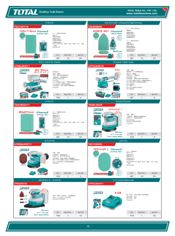 www.totalbusiness.comTOTAL TOOLS CO., PTE. LTD.www.totaltools.cn 01Unit Qty/Pack Qty/CtnPCS 1 20快充充電器/20V/4.0AUTFCLI20411輸入電壓:110-120V~50/60Hz 輸出電壓:21V 輸出電流:4A 彩盒包裝Unit Qty/Pack Qty/CtnPCS 1 1220V鋰電砂鼠三角砂紙機TPSLI2014電壓:20V 空載轉速:12000rpm 包括:1 件指墊 3 件指砂紙 3 件砂紙 彩盒包裝Unit Qty/Pack Qty/CtnSET 10 20砂紙套裝TAC125050尺寸:125mm 50 件 / 組 P40x10 件 P80x15 件 P120x15 件 P180x10 件 適用於研磨木材、牆壁、油漆、塑膠、石材、金屬、玻璃 雙泡罩包裝Unit Qty/Pack Qty/CtnPCS 1 4鋰電砂磨機UTROSLI20011電壓:20V 空載轉速:10000rpm 底部尺寸:5\充電電壓:110-120V~50/60Hz 配有 1 個 2.0Ah 電池組(TFBLI20011) 配有 1 個充電器(UTFCLI2001) 彩盒包裝Unit Qty/Pack Qty/CtnPCS 1 8鋰電圓砂機/20VTROSLI2002電壓:20V 空載轉速:8000-13000rpm 底部尺寸:125mm(5'') 附 5 張砂紙 電池和充電器單獨販售 彩盒包裝Unit Qty/Pack Qty/CtnSET 10 40砂紙套裝TAC0902311尺寸:90X231mm 50 件 / 套 P40x10 件 P80x15 件 P120x15 件 P180x10 適用於研磨木材、牆壁、油漆、塑膠、石材、金屬、玻璃 雙泡罩包裝Unit Qty/Pack Qty/CtnSET 1 6鋰電磁磚平鋪機-單2AUTTVLI20015電壓:20V 振動頻率:0-10000rpm 吸附力:60kg 吸盤直徑:130mm 速度調節:6 檔 充電電壓:220-240V~50/60Hz 含 1 個 2.0Ah 電池組(TFBLI20011) 附 1 個充電器(UTFCLI2001) 附 1 個護膝 附 1 個膩子刀 附 1 套 1.5mm 磁磚墊片 附 1 個磁磚Unit Qty/Pack Qty/CtnPCS 1 6鋰電方型磨砂機-單4A組UTFSLI20311無刷馬達 電壓:20V 底座:90mmx180mm 空載轉速:13000rpm 鋁製耐用底座包括: 5 件砂紙 1 件 4.0Ah 電池組(TFBLI20021) 1 件充電器(UTFCLI2001) 充電電壓:110-120V~50/60Hz 彩盒包裝Unit Qty/Pack Qty/CtnSET 10 20混裝鼠砂紙93*172mm/指型86*27mm/TAC938660尺寸:93*172mm 30pcs: P40x5pcs P80x10pcs P120x10pcs P180x5pcs 尺寸:86*27mm 30pcs: P40x5pcs P80x10pcs P120x10pcs P1020x5pcs P80x10pcs Unit Qty/Pack Qty/CtnSET 10 20砂紙套裝TAC145115尺寸 :145X114mm 50/ 組 P40x10pcs P80x15pcs P120x15pcs P180x10pcs 適用於研磨木材、牆壁、油漆、塑膠、石材、金屬、玻璃 雙泡罩包裝10