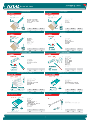 www.totalbusiness.comTOTAL TOOLS CO., PTE. LTD.www.totaltools.cn 01Unit Qty/Pack Qty/CtnPCS 12 360梅開扳手/7mmTCSPA071尺寸:7mm 長度:110mm 材質:Cr-V 鍍鉻,霧面飾面,塑膠衣架包裝Unit Qty/Pack Qty/CtnSET 1 109「超細纖維滾筒刷套裝/9寸THT811223041材質:微纖維 尺寸:230mm/9\纖維高度:12mm 適用於內牆 附 1 個 10 吋油漆托盤,尺寸:435x300x7.5mm 附 1 個圓柱形刷子支架,6mm 中心柄 配有 2 個超細纖維滾筒蓋 配有 4 個輔助柄 採用收縮包裝Unit Qty/Pack Qty/CtnSET 10 20超細纖維滾筒套裝/4寸THT811210061材質:超細纖維 尺寸:100mm/4\適用於內牆 附 4 個超細纖維滾筒套,6 毫米中心軸, 配有 1 個 4 英寸油漆托盤,採用收縮包裝Unit Qty/Pack Qty/CtnSET 20 40海綿和超細纖維套裝/11pcs/11pcsTHT81121001材質:超細纖維 + 聚酯泡沫 尺寸:100mm/4\適用於內壁和光滑表面 5.8mm 中心軸 附 5 個 12mm 壓克力迷你滾輪 附 5 個聚酯泡棉滾輪 雙泡罩包裝Unit Qty/Pack Qty/CtnPCS 12 24伸縮桿滾筒刷455~900MM/9\THT8592T材質:超細纖維 尺寸:230mm/9\纖維高度:12mm 適用於內牆 最小長度:455mm 最大長度:900mm 帶 1 個滾輪蓋 帶 4 個輔助柄 8mm 中心柄 帶 3 個伸縮鋁管 塑膠袋包裝Unit Qty/Pack Qty/CtnPCS 20 40單色柄滾筒刷/9\THT85096材質:超細纖維 尺寸:230mm/9\纖維高度:12mm 適用於內牆 5.8mm 中心軸, 附 1 個滾輪蓋,附 4 個輔助軸, 塑膠袋包裝Unit Qty/Pack Qty/CtnPCS 50 100迷你滾筒刷/4寸THT85046材質:超細纖維 尺寸:100mm/4\纖維高度:12mm 適用於內牆 5.8mm 中心軸, 附 1 個滾輪蓋, 塑膠袋包裝Unit Qty/Pack Qty/CtnPCS 12 120薄型塑膠柄油漆刷/4\THT843046寬度:4 英寸, 適用於油性塗料, 高品質刷毛, 獨特設計的塑膠手柄 刷毛長度:57 毫米 厚度:12 毫米 彩色套筒包裝Unit Qty/Pack Qty/CtnPCS 12 120塑膠柄油漆刷/4\THT84046尺寸:4 吋(100 毫米) 刷毛長度:64mm 厚度:22mm 高品質刷毛 彩色套筒包裝Unit Qty/Pack Qty/CtnPCS 12 120薄型塑膠柄油漆刷/3\THT843036寬度:3 英寸,適用於油性塗料, 高品質刷毛,獨特設計的塑膠手柄 刷毛長度:57 毫米 厚度:11 毫米 彩色套筒包裝109