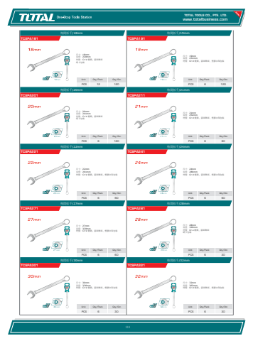 www.totalbusiness.comTOTAL TOOLS CO., PTE. LTD.www.totaltools.cn 01Unit Qty/Pack Qty/CtnPCS 6 30梅開扳手/32mmTCSPA321尺寸:32mm 長度:362mm 材質:Cr-V 鍍鉻,霧面飾面,塑膠衣架包裝Unit Qty/Pack Qty/CtnPCS 6 30梅開扳手/30mmTCSPA301尺寸:30mm 長度:336mm 材質:Cr-V 鍍鉻,霧面飾面,塑膠衣架包裝Unit Qty/Pack Qty/CtnPCS 6 30梅開扳手/28mmTCSPA281尺寸:28mm 長度:320mm 材質:Cr-v 鍍鉻,霧面飾面 紙卡包裝Unit Qty/Pack Qty/CtnPCS 6 60梅開扳手/27mmTCSPA271尺寸:27mm 長度:320mm 材質:Cr-V 鍍鉻,霧面飾面,塑膠衣架包裝Unit Qty/Pack Qty/CtnPCS 6 60梅開扳手/24mmTCSPA241尺寸:24mm 長度:286mm 材質:Cr-V 鍍鉻,霧面飾面,塑膠衣架包裝Unit Qty/Pack Qty/CtnPCS 6 90梅開扳手/22mmTCSPA221尺寸:22mm 長度:261mm 材質:Cr-V 鍍鉻,霧面飾面,塑膠衣架包裝Unit Qty/Pack Qty/CtnPCS 6 90梅開扳手/21mmTCSPA211尺寸:21mm 長度:252mm 材質:Cr-V 鍍鉻,霧面飾面,塑膠衣架包裝Unit Qty/Pack Qty/CtnPCS 6 120梅開扳手/20mmTCSPA201尺寸:20mm 長度:241mm 材質:Cr-V 鍍鉻,霧面飾面 紙卡包裝Unit Qty/Pack Qty/CtnPCS 6 120梅開扳手/19mmTCSPA191尺寸:19mm 長度:231mm 材質:Cr-V 鍍鉻,霧面飾面,塑膠衣架包裝Unit Qty/Pack Qty/CtnPCS 12 120梅開扳手/18mmTCSPA181尺寸:18mm 長度:220mm 材質:Cr-V 鍍鉻,霧面飾面 紙卡包裝111