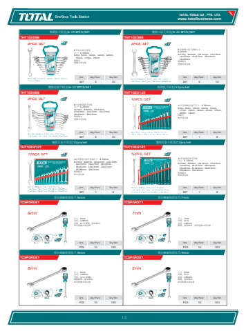 www.totalbusiness.comTOTAL TOOLS CO., PTE. LTD.www.totaltools.cn 01Unit Qty/Pack Qty/CtnPCS 10 120單向棘輪梅開扳手/9mmTCSPAR091尺寸:9mm 材質:Cr-V 長度:150mm 鍍鉻,霧面飾面, 採用塑膠衣架包裝Unit Qty/Pack Qty/CtnPCS 10 120單向棘輪梅開扳手/8mmTCSPAR081尺寸:8mm 長度:140mm 材質:Cr-V CrMo 棘輪鍍鉻,霧面飾面, 採用塑膠衣架包裝Unit Qty/Pack Qty/CtnPCS 10 120單向棘輪梅開扳手/7mmTCSPAR071尺寸:7mm 材質:Cr-V 長度:140mm 鍍鉻,霧面飾面,採用塑膠衣架包裝Unit Qty/Pack Qty/CtnPCS 10 120單向棘輪梅開扳手/6mmTCSPAR061尺寸:6mm 長度:128mm 材質:Cr-V 鍍鉻,霧面飾面, 採用塑膠衣架包裝Unit Qty/Pack Qty/CtnSET 1 8雙梅花扳手組套/12pcs/setTHT102412112 件組梅花扳手套裝 尺寸:6-32mm 6x7mm、8x9mm、10x11mm、12x13mm、14x15mm、16x17mm、18x19mm、20x22mm、21X23mm、24X27mm、25X28mm、30X32mm 精細拋光 帆布袋包裝Unit Qty/Pack Qty/CtnSET 1 8雙開口扳手組套/12pcs/setTHT102312112 件雙開口扳手套裝尺寸:6-32mm 6x7mm、8x9mm、10x11mm、12x13mm、14x15mm、16x17mm、18x19mm、20x22mm、21X23mm、24X27mm、25X28mm、30X32mm 精細拋光 帆布袋包裝Unit Qty/Pack Qty/CtnSET 1 8梅開扳手組套/12pcs/setTHT102212212 件套裝組合扳手尺寸:6-32mm 6mm、8mm、10mm、12mm、14mm、17mm、19mm、22mm、24mm、27mm、30mm、32mm 細拋光 帆布袋包裝Unit Qty/Pack Qty/CtnSET 5 10雙梅花扳手組套/6-22 8PCS/SETTHT1024868 件組梅花扳手套裝 尺寸:6-22mm 6x7mm、8x9mm、10x11mm 12x13mm、14x15mm、16x17mm 18x19mm、20x22mm 精細拋光 塑膠衣架包裝Unit Qty/Pack Qty/CtnSET 5 10雙開口扳手組套/6-22 8PCS/SETTHT1023868 件雙開口扳手套裝尺寸: 6-22mm 6x7mm、8x9mm、10x11mm、12x13mm、14x15mm、16x17mm、18x19mm、20x22mm 精細拋光 塑膠衣架包裝Unit Qty/Pack Qty/CtnSET 5 10梅開扳手組套/6-19 8PCS/SETTHT1022868 件組合扳手套裝 尺寸:6-19mm 6mm、8mm、10mm、12mm、14mm、15mm、17mm、19mm 細拋光 塑膠衣架包裝112