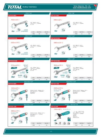 www.totalbusiness.comTOTAL TOOLS CO., PTE. LTD.www.totaltools.cn 01Unit Qty/Pack Qty/CtnPCS 12 48短柄管活一體兩用扳手/6THT1016S二合一功能:活動扳手和管鉗 長度:156mm(6 吋),CrV 寬可調夾具尺寸:0-24mm 可更換頭 獨特設計 雙色軟手把 採用展示盒包裝Unit Qty/Pack Qty/CtnPCS 4 16膠柄活動扳手/12\THT101126獨特設計手柄長度:300mm(12 吋), CrV 可調式夾具尺寸:0-45mm 雙色橡膠把手 雙泡罩包裝Unit Qty/Pack Qty/CtnPCS 6 24膠柄活動扳手/10\THT101106獨特設計手把長度:250mm(10 吋), CrV 可調式夾具尺寸:0-40mm 雙色橡膠把手 雙泡罩包裝Unit Qty/Pack Qty/CtnPCS 6 60膠柄活動扳手/6\THT101066獨特設計手柄長度:150mm(6 吋), CrV 可調式夾具尺寸:0-28.5mm 雙色橡膠把手 雙泡罩包裝Unit Qty/Pack Qty/CtnPCS 1 12活動扳手/18\THT1010183長度:450mm(18 吋) 可調式夾具尺寸:0-53mm 材質:45# 碳鋼 紙卡包裝Unit Qty/Pack Qty/CtnPCS 2 16活動扳手/15\THT1010153長度:375mm(15 吋) 可調夾具尺寸:0-43mm 材質:45# 碳鋼 紙卡包裝Unit Qty/Pack Qty/CtnPCS 6 24活動扳手/12\THT1010123長度:300 毫米(12 吋) 可調式夾具尺寸:0-40mm 紙卡包裝Unit Qty/Pack Qty/CtnPCS 6 24活動扳手/10\THT1010103長度:250 毫米(10 吋) 可調式夾具尺寸:0-35mm 紙卡包裝Unit Qty/Pack Qty/CtnPCS 6 36活動扳手/8\THT101083長度:200 毫米(8 吋) 可調式夾具尺寸:0-29mm 紙卡包裝Unit Qty/Pack Qty/CtnPCS 10 120活動扳手/6\THT101063長度:150 毫米(6 吋) 可調式夾具尺寸:0-24mm 紙卡包裝115