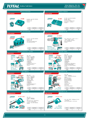 www.totalbusiness.comTOTAL TOOLS CO., PTE. LTD.www.totaltools.cn 01Unit Qty/Pack Qty/CtnPCS 1 4鋰電鼓風機-單主機TABLI20028電壓:20V 空載轉速:18000rpm 最大風量:2.7m³/min 電池和充電器單獨販售,採用彩盒包裝Unit Qty/Pack Qty/CtnPCS 1 4鋰電鼓風機-單2AUTABLI20781電壓:20V 空載轉速:18000rpm 最大風量:2.7m³/min 包括: 1 個 2.0Ah 電池組(TFBLI20011) 1 個充電器(UTFCLI2001) 充電電壓:110-120V~50/60Hz 彩盒包裝Unit Qty/Pack Qty/CtnPCS 1 1鋰電210mm斜切鋸TMSLI2021電壓:20V 空載轉速:4500rpm 刀片尺寸:210mm(8\切割能力 0°*0°:120*60mm 45°*0°:83*60mm 0°*45°:120*34mm 45°*45°:83*34mm 1 個防塵袋 1 個六角扳手 1 個 TCT 木工鋸片 1 套垂直夾具 2 個工作空間 包裝電池和電池包裝裝置 Unit Qty/Pack Qty/CtnPCS 1 8鋰電不鏽鋼噴壺TSGLI20041電壓:20V 噴塗壓力:0.1-0.2Bar 最大流量:800ml/min 最大黏度:120DIN-s 容器容量:800ml 容器材質:不鏽鋼 可調式噴塗幅度包括: 1 個除塵噴嘴 1 個黏度量杯 1 個噴嘴清潔針 2 個銅噴嘴(1.5/2.5 毫米) 電池和充電器單獨出售 彩盒包裝Unit Qty/Pack Qty/CtnPCS 1 8鋰電電噴槍-單2A組UTSGLI20042電壓:20V 噴塗壓力:0.1-0.2Bar 最大流量:800ml/min 最大黏度:120DIN-s 容器容量:1000ml 可調式噴塗幅度包括: 1 個除塵噴嘴 1 個黏度量杯 1 個噴嘴清潔針 2 個銅噴嘴 1 個 2Ah 電池組 (TFBLI20011) 1 個充電器 (UTFCLI2001) 充電電壓:110-120V~50/60Hz 彩盒包裝Unit Qty/Pack Qty/CtnPCS 1 8鋰電噴漆吹風兩用機 單主機/20VTSGLI2004電壓:20V 噴塗壓力:0.1-0.2Bar 最大流量:800ml/min 最大黏度:120DIN-s 容器容量:1000ml 可調式噴塗幅度包括: 1 個除塵噴嘴 1 個黏度量杯 1 個噴嘴清潔針 2 個銅噴嘴(1.5/2.5 毫米) 電池和充電器單獨出售 彩盒包裝Unit Qty/Pack Qty/CtnPCS 1 8鋰電熱熔器-單主機TWTLI2018電壓:20V 額定溫度:0-320℃ 夾持尺寸:20mm、25mm、32mm 包括:3 個替換頭 1 個六角扳手 電池和充電器單獨出售 彩盒包裝Unit Qty/Pack Qty/CtnPCS 1 620V六頭充電器4.0AHUTFCLI2064輸入電壓:110-120V~50/60Hz 輸出電壓:20V 輸出電流:4A 最多可容納 6 個 P20S 電池組 依序為電池充電彩盒包裝Unit Qty/Pack Qty/CtnPCS 1 2020V雙插充電器8.0AUTFCLI2082輸入電壓:110-120V~50/60Hz 輸出電壓:20V 輸出電流:4A+4A 最多可容納 2 個 P20S 電池組 雙活動電池埠,可單獨充電 彩盒包裝Unit Qty/Pack Qty/CtnPCS 1 2020V快速充電器4.0AHUTFCLI2003輸入電壓:110-120V~50/60Hz 輸出電壓:21V 輸出電流:4A 彩盒包裝11