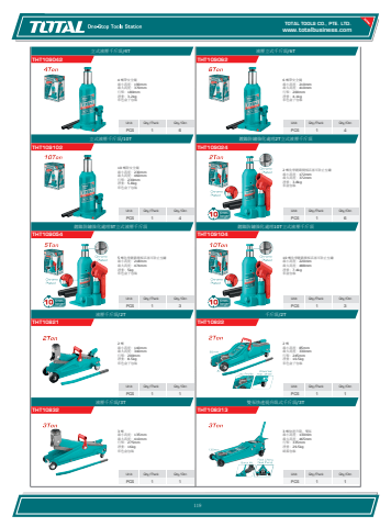www.totalbusiness.comTOTAL TOOLS CO., PTE. LTD.www.totaltools.cn 01Unit Qty/Pack Qty/CtnPCS 1 1雙泵快速提升臥式千斤頂/3TTHT1083133 噸快速升降,雙泵 最小高度:130mm 最大高度:465mm 行程:335mm 淨重:29.5kg 紙箱包裝Unit Qty/Pack Qty/CtnPCS 1 1液壓千斤頂/3TTHT108323 噸 最小高度:135mm 最大高度:410mm 行程:275mm 淨重:16kg 彩色盒包裝Unit Qty/Pack Qty/CtnPCS 1 1千斤頂/2TTHT108222 噸 最小高度:85mm 最大高度:330mm 行程:245mm 淨重:10.5kg 彩色盒子包裝Unit Qty/Pack Qty/CtnPCS 1 1液壓千斤頂/2TTHT108212 噸 最小高度:140mm 最大高度:340mm 行程:200mm 淨重:8.5kg 彩色盒子包裝Unit Qty/Pack Qty/CtnPCS 1 3鍍鎳防鏽強化處理10T立式液壓千斤頂THT10910410 噸化學鍍鉻閘板活塞可防止生鏽 最小高度:220mm 最大高度:488mm 淨重:7.4kg 彩盒包裝Unit Qty/Pack Qty/CtnPCS 1 3鍍鎳防鏽強化處理5T立式液壓千斤頂THT1090545 噸化學鍍鉻閘板活塞可防止生鏽 最小高度:218mm 最大高度:474mm 淨重:5kg 彩色盒子包裝Unit Qty/Pack Qty/CtnPCS 1 6鍍鎳防鏽強化處理2T立式液壓千斤頂THT1090242 噸化學鍍鉻閘板活塞可防止生鏽 最小高度:172mm 最大高度:372mm 淨重:3.8kg 彩盒包裝Unit Qty/Pack Qty/CtnPCS 1 4立式液壓千斤頂/10TTHT10910210 噸附安全閥 最小高度:230mm 最大高度:460mm 行程:230mm 淨重:5.8kg 彩色盒子包裝Unit Qty/Pack Qty/CtnPCS 1 4液壓立式千斤頂/6TTHT1090626 噸帶安全閥 最小高度:210mm 最大高度:410mm 行程:200mm 淨重:4.1kg 彩色盒子包裝Unit Qty/Pack Qty/CtnPCS 1 6立式液壓千斤頂/4TTHT1090424 噸帶安全閥 最小高度:190mm 最大高度:370mm 行程:180mm 淨重:3.2kg 彩色盒子包裝119