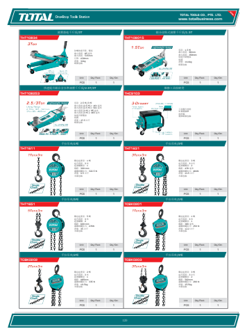 www.totalbusiness.comTOTAL TOOLS CO., PTE. LTD.www.totaltools.cn 01Unit Qty/Pack Qty/CtnPCS 1 1手拉吊車/3噸TCBK0203額定起重量:3 噸 起升高度:3 公尺 起重鏈數量:2 鉤距:562mm 滿載時鏈拉力:290 N 淨重:25.5kg 木箱包裝Unit Qty/Pack Qty/CtnPCS 1 1手拉吊車/2噸TCBK0202額定起重量:2 噸 起升高度:3 米 起重鏈數量:1 鉤距:485mm 滿載時鏈拉力:335 N 淨重:19.5kg 木箱包裝Unit Qty/Pack Qty/CtnPCS 1 1手拉吊車/1噸TCBK0201額定起重量:1 噸 起升高度:3 米 起重鏈數量:1 鉤距:383 毫米 滿載時鏈拉力:250 N 淨重:12.2 公斤 木箱包裝Unit Qty/Pack Qty/CtnPCS 1 1手拉吊車/5噸THT1651額定起重量:5 噸 起升高度:3 米 起重鏈數:2 鉤距:600 mm 滿載時鏈拉力:476N 淨重:35 公斤 木箱包裝Unit Qty/Pack Qty/CtnPCS 1 1手拉吊車/3噸THT1631額定起重量:3 噸 起升高度:3 公尺 起重鏈數量:2 鉤距:470 毫米 滿載時鏈拉力:404N 淨重:21.5 公斤 木箱包裝Unit Qty/Pack Qty/CtnPCS 1 1手拉吊車/1噸THT1611額定起重量:1 噸 起升高度:3 米 起重鏈數量:1 鉤距:300 mm 滿載時鏈拉力:322.5 N 淨重:9.5 公斤 木箱包裝Unit Qty/Pack Qty/CtnPCS 1 1維修工具收納凳THCS103工具爬行座椅 3 個側抽屜 前托盤 後架紙箱包裝Unit Qty/Pack Qty/CtnPCS 1 1快速提升鋁合金水準液壓千斤頂/2.5T/3TTHT108253容量:2.5 噸 /3 噸 最小高度 (2.5 噸 ): 161 毫米 最大高度 (2.5 噸 ): 541 毫米 最小高度 (3 噸 ): 85 毫米 最大高度 (3 噸 ): 465 毫米 快速升降雙泵 低調 淨重 : 27.5 公斤 紙箱包裝Unit Qty/Pack Qty/CtnPCS 1 1鋁合金臥式液壓千斤頂/1.5TTHT108015容量:1.5 噸 最小高度:90mm 最大高度:358mm 快速升降雙泵 低調 淨重:14.4kg 紙箱包裝Unit Qty/Pack Qty/CtnPCS 1 1液壓落地千斤頂/3TTHT108343 噸快速升降,雙泵 最小高度:85 毫米 最大高度:515mm 行程:430mm 淨重:32kg 紙箱包裝120