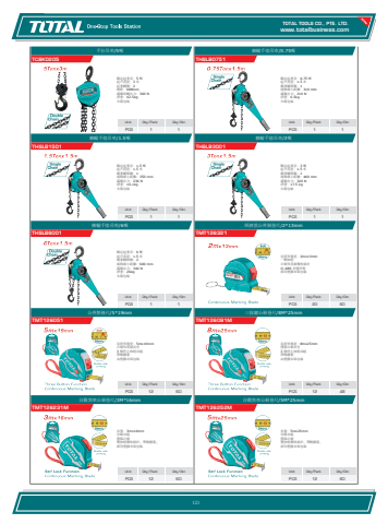 www.totalbusiness.comTOTAL TOOLS CO., PTE. LTD.www.totaltools.cn 01Unit Qty/Pack Qty/CtnPCS 12 60自動煞車公制卷尺/5M*25mmTMT126252M長寬:5mx25mm 自鎖功能 僅限公制 雙按鈕獨特設計,帶橡膠蓋, 採用塑膠衣架包裝Unit Qty/Pack Qty/CtnPCS 12 60自動煞車公制卷尺/3M*16mmTMT126231M長寬:3mx16mm 自鎖功能 僅限公制 雙按鈕獨特設計,帶橡膠蓋, 採用塑膠衣架包裝Unit Qty/Pack Qty/CtnPCS 12 48三按鍵公制卷尺/8M*25mmTMT126081M長度和寬度:8mx25mm 僅限公制具有 3 個停止按鈕功能 帶橡膠蓋 由塑膠衣架包裝Unit Qty/Pack Qty/CtnPCS 12 60公英製捲尺/5*19mmTMT126051長度和寬度:5mx19mm 公制和英制具有 3 個停止按鈕功能 帶橡膠蓋 由塑膠衣架包裝Unit Qty/Pack Qty/CtnPCS 20 60經濟款公英制卷尺/2*13mmTMT126321長度和寬度:2mx13mm 一個按鈕 公制和英制獨特設計 純 ABS 材質外殼 採用塑膠衣架包裝Unit Qty/Pack Qty/CtnPCS 1 1棘輪手搖吊車/6噸THSLB6001額定起重量:6 噸 起升高度:1.5 米 載重鏈股數:2 兩鉤最小距離:600 mm 滿載拉力:340 N 淨重:26kg 木箱包裝Unit Qty/Pack Qty/CtnPCS 1 1棘輪手搖吊車/3噸THSLB3001額定起重量:3 噸 起升高度:1.5 米 載重鏈股數:1 兩鉤最小距離:460 mm 滿載拉力:320 N 淨重:17.5 kg 木箱包裝Unit Qty/Pack Qty/CtnPCS 1 1棘輪手搖吊車/1.5噸THSLB1501額定起重量:1.5 噸 起升高度:1.5 米 載重鏈股數:1 兩鉤最小距離:350 mm 滿載拉力:236 N 淨重:10.1kg 木箱包裝Unit Qty/Pack Qty/CtnPCS 1 1棘輪手搖吊車/0.75噸THSLB0751額定起重量:0.75 噸 起升高度:1.5 米 載重鏈股數:1 兩鉤最小距離:310 mm 滿載拉力:210 N 淨重:6.5kg 木箱包裝Unit Qty/Pack Qty/CtnPCS 1 1手拉吊車/5噸TCBK0205額定起重量:5 噸 起升高度:3 米 起重鏈數:2 鉤距:688mm 滿載時鏈拉力:360 N 淨重:42.5kg 木箱包裝121