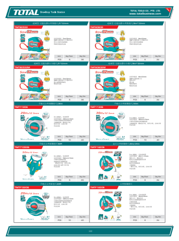 www.totalbusiness.comTOTAL TOOLS CO., PTE. LTD.www.totaltools.cn 01Unit Qty/Pack Qty/CtnPCS 6 24公英製纖維尺TMTF183063:1 齒輪比,可快速倒帶 長度和寬度:30mx15mm 雙色刀片,雙面列印 配有多功能環端鉤和爪帶 公制和英制 純材料伸縮裝置 全橡膠蓋 一體式手柄,使用方便,存放方便 彩盒包裝Unit Qty/Pack Qty/CtnPCS 10 40手捲式公英制卷尺20MTMTF122063:1 齒輪比,快速倒帶 長度和寬度:20mx12.5mm 公制和英制純材質伸縮裝置 全橡膠覆蓋一體成型手柄, 使用方便,存放方便 彩盒包裝Unit Qty/Pack Qty/CtnPCS 6 24盒式公英制纖維尺20m/20mTMTF182063:1 齒輪比,可快速倒帶 長度和寬度:20m x 15mm 雙色刀片,雙面列印 配有多功能環端鉤和爪帶 公制和英制 純材料伸縮裝置 全橡膠蓋 一體式手柄,使用方便,存放方便 彩盒包裝Unit Qty/Pack Qty/CtnPCS 5 20手提式公英制鋼卷尺50MTMT7105063:1 齒輪比,快速倒帶 長度和寬度:50mx12.5mm 公制和英制純材質 伸縮裝置全橡膠覆蓋 一體成型手柄,使用方便, 存放方便人體工學手柄 彩盒包裝Unit Qty/Pack Qty/CtnPCS 10 40手捲式公英制鋼卷尺/30mTMT113063:1 齒輪比,快速倒帶 長度和寬度:30mx12.5mm 公制和英制純材質伸縮裝置 全橡膠覆蓋一體成型手柄,使用方便,存放方便 彩盒包裝Unit Qty/Pack Qty/CtnPCS 10 40手捲式公英制鋼卷尺/20mTMT112063:1 齒輪比,快速倒帶 長度和寬度:20mx12.5mm 公制和英制純材質伸縮裝置 全橡膠覆蓋一體成型手柄, 使用方便,存放方便 彩盒包裝Unit Qty/Pack Qty/CtnPCS 6 24超硬型 尼龍包膠公分捲尺/8m*32mmTMT80832M長度和寬度:8mx32mm 360°尼龍塗層刀片 雙面列印 僅公制 雙鉤帶磁性 雙泡罩包裝Unit Qty/Pack Qty/CtnPCS 6 36超硬型 尼龍包膠公分捲尺/5*32mmTMT80532M長度和寬度:5mx32mm 360°尼龍塗層刀片雙面列印 僅公制雙鉤帶磁性 雙泡罩包裝Unit Qty/Pack Qty/CtnPCS 6 24超硬型 尼龍包膠公英製捲尺/8m*32mmTMT80832長度和寬度:8mx32mm 360°尼龍塗層刀片雙面列印 帶有公制和英制雙鉤 帶磁性雙泡罩包裝Unit Qty/Pack Qty/CtnPCS 6 36超硬型 尼龍包膠公英製捲尺/5*32mmTMT80532長度和寬度:5mx32mm 360°尼龍塗層刀片雙面列印 帶有公制和英制雙鉤 帶磁性雙泡罩包裝122