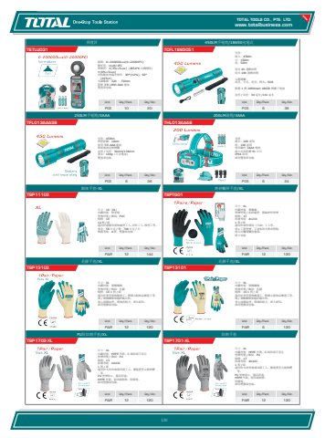 www.totalbusiness.comTOTAL TOOLS CO., PTE. LTD.www.totaltools.cn 01Unit Qty/Pack Qty/CtnPAIR 12 120防割手套TSP1701-XL尺寸:XL 內襯材質:HPPE 外殼,C 級防割手套芯 塗層材質 / 飾面:PU 規格:13 防護等級:4X42C 1 對 / 紙 適用於木材和玻璃切割工人、搬運重型尖銳物體等。 PU 塗層掌心,靈活舒適。 HPPE 外殼,耐切割耐磨。 防靜電。 採用塑膠袋包裝。Unit Qty/Pack Qty/CtnPAIR 12 120PU防切割手套/XLTSP1702-XL尺寸:XL 內襯材質:HPPE 外殼,C 級防割手套芯 塗層材質 / 飾面:PU 規格:13 防護等級:4X43C 1 對 / 紙 適用於木材和玻璃切割工人、搬運重型尖銳物體等。 PU 塗層掌心,靈活舒適。 HPPE 外殼,耐切割耐磨。防靜電。 採用塑膠袋包裝。Unit Qty/Pack Qty/CtnPAIR 6 120乳膠手套/XLTSP13101尺寸:XL 內襯材質:聚酯纖維 塗佈材質 / 飾面:乳膠 規格:10 1 對 / 紙 適用於重型貨物搬運工、輕微尖銳物品搬運工等。 棉 / 聚酯纖維無縫針織布料。 掌心浸膠紋理,增強抓握力,經久耐用。 採用塑膠袋包裝。Unit Qty/Pack Qty/CtnPAIR 12 120乳膠手套/XLTSP13102尺寸:XL 內襯材質:聚酯纖維 塗佈材質 / 飾面:乳膠 規格:10 1 對 / 紙 適用於重型貨物搬運工、輕微尖銳物品搬運工等。 棉 / 聚酯纖維無縫針織布料。 掌心浸膠紋理,增強抓握力,經久耐用。 採用塑膠袋包裝。Unit Qty/Pack Qty/CtnPAIR 12 120磨砂觸屏手套/XLTSPTG01尺寸:XL 內襯材質:聚酯線 塗層材質 / 表面處理:腈綸磨砂塗層 規格:15 防護等級:4121X 1 對 / 紙 適用於油性環境(少油)工人等。 掌心丁腈塗層,手掌表面光滑或粗糙。 指尖可觸碰觸控螢幕。 紙卡包裝Unit Qty/Pack Qty/CtnPAIR 12 144點珠手套-XLTSP11102尺寸:10(XL) 內襯材質:燈罩棉 塗佈材質 / 飾面:PVC 規格:10 12 對 / 紙 適用於運輸和貨物處理工人、回收工人、修理工等。 重量:58 公克 / 雙;700 公克 / 打 棉質等級:A 級,塑膠袋包裝Unit Qty/Pack Qty/CtnPCS 6 24200LM頭燈/3AAATHL013AAA6亮度: 最大:200 流明 低:100 流明 使用鹼性 3AAA 電池 最大光束距離 91 公尺 IPX4 防雨 採用雙泡罩包裝Unit Qty/Pack Qty/CtnPCS 6 36250LM手電筒/3AAATFL013AAA58亮度:450lm 照射距離:160m 使用 3 顆 AAA 電池 無需電池尾燈開關 直徑 / 長度:34mm/136mm 重量:104g(不含電池) 雙泡罩包裝Unit Qty/Pack Qty/CtnPCS 6 36450LM手電筒/18650充電式TCFL1865051亮度: 最大:450lm 中:150lm 低:50lm 高光 4h 運轉時間 低光 18h 運轉時間 五檔開關: 高亮、中亮、低亮、閃光、SOS 配備 1 個 2600mah 18650 鋰離子電池 直徑 / 長度:34 毫米 /141 毫米 Unit Qty/Pack Qty/CtnPCS 10 20照度計TETLU031範圍:0~200000Lux(0~20000FC) 解析度:1LUX/1FC 準確度:±(3%+5Lux)(2854°K 白熾燈時) ±(6%+5Lux) 其他餘弦角偏差特性:30°(±2%);60°(±6%±); 光譜範圍:320 ~ 730nm 搭配 3 顆 LR03 AAA 電池 雙泡罩包裝130