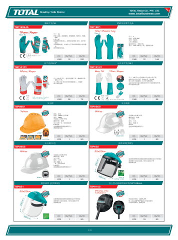 www.totalbusiness.comTOTAL TOOLS CO., PTE. LTD.www.totaltools.cn 01Unit Qty/Pack Qty/CtnPCS 10 20掌上型式玻璃焊接面罩/50*108mmTSP9102焊接面罩材質:100% PP 附 1 塊 108*50*3mm 焊接玻璃和 1 塊保護玻璃,標籤包裝Unit Qty/Pack Qty/CtnPCS 1 20割草面罩 (透明鋁邊)TSP631抗衝擊遮陽板帽簷保護額頭免受外界傷害 頭帶帶有可調式旋鈕,配有抗菌防汗帶 按標籤包裝Unit Qty/Pack Qty/CtnPCS 1 20割草面罩(黑網)TSP622超清晰視野網狀遮陽板帽簷保護額頭免受外界傷害 頭帶帶有可調式旋鈕,配有抗菌防汗帶 按標籤包裝Unit Qty/Pack Qty/CtnPCS 1 20安全帽/白色TSP2602有通風口的 PE 外殼 襯裡材質:緞帶 含下巴帶 顏色:白色 重量 380 克 「V」型頂部加固 4 點懸吊 透過棘輪旋鈕調整頭部尺寸Unit Qty/Pack Qty/CtnPCS 1 20安全頭盔TSP2609有通風口的 PE 外殼 襯裡材質:塑膠 含下巴帶 顏色:白色 重量:330 克 點懸掛 透過扣環調整頭部尺寸Unit Qty/Pack Qty/CtnPCS 1 20安全帽TSP8601顏色:黃色 材質:100% 全新 PE 重量:380g 有通風口的 PE 外殼 襯裡材質:緞帶 含下巴帶「V」型頂部加固 6 點懸掛 透過棘輪旋鈕調整頭部尺寸 透過標籤包裝Unit Qty/Pack Qty/CtnPAIR 1 96山羊皮手套/16寸TSP19141尺寸:16 英寸白色頭層山羊皮掌心和手背, 兩層天然牛皮手脖,拇指皮革,無內襯, 凱夫拉防火線縫製。山羊皮柔軟耐熱; 這款手套非常適合需要耐用性和手感的艱钜任務。 採用塑膠袋包裝。Unit Qty/Pack Qty/CtnPAIR 36 72皮手套/10.5\TSP14101尺寸:10.5 英寸,適用於運輸工具、機械操作員、園藝工作等。 牛二層皮手套 棉布背部和橡膠袖口,半襯裡 聚乙烯袋包裝Unit Qty/Pack Qty/CtnPAIR 72 144PVC長清潔手套/LTSP1801尺寸:L 材質:優質 PVC 長度:32cm 1 對 / 塑膠袋 適用於園丁、清潔工等。 重量:105-110 克 / 對,塑膠袋包裝Unit Qty/Pack Qty/CtnPAIR 12 120機械手套/XLTSP1806-XL尺寸:XL 材質:海綿、超細纖維、聚酯纖維、樓梯布、橡膠、PVC 1 對 / 紙 超細纖維材質掌心,搭配加強 PVC 皮革,提升耐磨性。 背部橡膠材質,有效防止手部在黑暗環境中受到傷害。 採用塑膠袋包裝。131