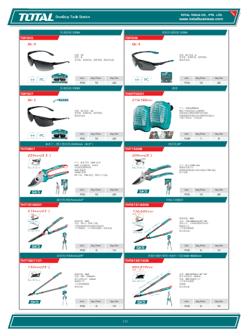 www.totalbusiness.comTOTAL TOOLS CO., PTE. LTD.www.totaltools.cn 01Unit Qty/Pack Qty/CtnPCS 6 12伸縮杆鐵杆樹剪-4連杆刀頭/660-860mmTHTS1527406長度:660-870mm 26\最大切割直徑:25mm 材質:SK5 熱處理刀片 刀片塗有特氟隆 伸縮軸 紙衣架包裝Unit Qty/Pack Qty/CtnPCS 6 12高枝剪/725mm/29\THT1527101頭部材質:SK5 長度:29\最大切割直徑:23mm 熱處理刀片 刀片噴塗鐵氟隆 紙架包裝Unit Qty/Pack Qty/CtnPCS 6 12伸縮式樹籬剪THTS1516306頭部材質:SK5 長度:730-880mm/29\波浪刀片,大面積切割效率更高 熱處理刀片 刀片噴塗鐵氟隆 紙衣架包裝Unit Qty/Pack Qty/CtnPCS 6 12籬笆剪/557mm/22\THT1516001頭部材質:SK5 長度:23 吋(575 公釐) 可實現精確塑形和精確切割效果 刀片熱處理,刀片噴塗特氟隆,紙架包裝Unit Qty/Pack Qty/CtnPCS 12 48修枝剪/8\THT15308尺寸:8 吋 /205 mm 配備高品質刀片 配備熱處理鋁製手柄和柔軟的 TPR 握把 紙卡包裝Unit Qty/Pack Qty/CtnPCS 12 488.5寸一體式修枝剪/220mm(8.5\THT0601尺寸:8.5 英吋(220 毫米) SK5 全金屬框架,更耐用 高品質花園修枝剪 SK5 熱處理 Telfon 塗層 PP 手柄,TPR 握把,吸塑卡片包裝Unit Qty/Pack Qty/CtnPAIR 1 6護膝THKPT0201尺寸:215x180mm PVC 外殼提供最大抗衝擊性 模壓泡棉主體提供額外的舒適性 兩個鬆緊帶和靈活的扣環確保舒適貼合 人體工學設計,彩盒包裝Unit Qty/Pack Qty/CtnPCS 12 48防護眼鏡 DIN5TSP307材質:PC 暗度:10 重量輕,配戴舒適,視野寬闊, 雙泡罩包裝Unit Qty/Pack Qty/CtnPCS 12 48軟框防護眼鏡 DIN4TSP306材質:PC 暗度:4 重量輕,配戴舒適,視野寬闊, 雙泡罩包裝Unit Qty/Pack Qty/CtnPCS 12 48防護眼鏡 DIN4TSP305材質:PC 暗度:8 重量輕,配戴舒適,視野寬闊,雙泡罩包裝133