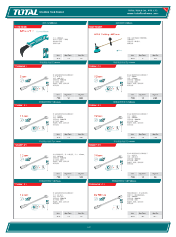 www.totalbusiness.comTOTAL TOOLS CO., PTE. LTD.www.totaltools.cn 01Unit Qty/Pack Qty/CtnPCS 20 200雙搖頭套筒扳手/8*10mmTDFSW08101雙頭活動頭扳手,附 12 點套筒, 套筒尺寸:8mm&10mm, 長度:184mm 套筒材質:50BV30 扳手材質:CRV 熱處理,鍍鉻,霧面表面 紙架包裝Unit Qty/Pack Qty/CtnPCS 12 72單搖頭套筒扳手/17mmTOESH171附 12 點套筒的組合活動頭扳手 尺寸:17 毫米 長度:233 毫米 套筒材質:50BV30 扳手材質:CRV 熱處理,鍍鉻,霧面表面 紙架包裝Unit Qty/Pack Qty/CtnPCS 12 96單搖頭套筒扳手/14MMTOESH141附 12 點套筒的組合活動頭扳手 尺寸:14 毫米 長度:225 毫米 套筒材質:50BV30 扳手材質:CRV 熱處理,鍍鉻,霧面表面 紙架包裝Unit Qty/Pack Qty/CtnPCS 12 120單搖頭套筒扳手/13mmTOESH131組合活動頭扳手,附 12 點套筒,尺寸:13mm, 長度:207mm 套筒材質:50BV30 扳手材質:CRV 熱處理,鍍鉻,霧面表面 紙架包裝Unit Qty/Pack Qty/CtnPCS 12 144單搖頭套筒扳手/12mmTOESH121附 12 點套筒的組合活動頭扳手 尺寸:12mm 長度:195mm 套筒材質:50BV30 扳手材質:CRV 熱處理,鍍鉻,霧面表面 紙架包裝Unit Qty/Pack Qty/CtnPCS 12 180單搖頭套筒扳手/11mmTOESH111附 12 點套筒的組合活動頭扳手 尺寸:11mm 長度:185mm 套筒材質:50BV30 扳手材質:CRV 熱處理,鍍鉻,霧面表面 紙架包裝Unit Qty/Pack Qty/CtnPCS 12 240單搖頭套筒扳手/10mmTOESH101附 12 點套筒的組合活動頭扳手 尺寸:10mm 長度:173mm 套筒材質:50BV30 扳手材質:CRV 熱處理,鍍鉻,霧面表面 紙架包裝Unit Qty/Pack Qty/CtnPCS 12 300單搖頭套筒扳手/8mmTOESH081附 12 點套筒的組合活動頭扳手 尺寸:8 毫米 長度:160 毫米 套筒材質:50BV30 扳手材質:CRV 熱處理,鍍鉻,霧面表面 紙架包裝Unit Qty/Pack Qty/CtnPCS 2 40圓規玻璃刀/60cmTGCT16001材質:6 把 YG6X 刀橡膠吸盤, 金屬刻度尺, 切割直徑:60 釐米, 標籤包裝Unit Qty/Pack Qty/CtnPCS 12 72地毯刀/180mmTHT51886尺寸:180mm 弧形刀片材質:不銹鋼 獨特設計手柄 滑動卡包裝147