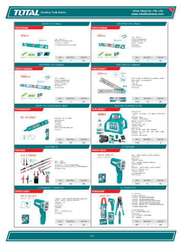 www.totalbusiness.comTOTAL TOOLS CO., PTE. LTD.www.totaltools.cn 01Unit Qty/Pack Qty/CtnSET 1 20電工測試5件套件TOS23026件 / 套件包括: 1 件數位交流鉗形表: 交流電流:4A/40A/400A/600A 交流電壓:4V/40V/400V/600V 直流電壓:400mV/4V/40V/400V/600V 直流電壓:400mV/4V/40V/400V/600V 直流電壓:400/4) 電容:%u0017QI%u0012%u0017%u0013QI%u0012%u0017%u0013%u0013QI%u0012%u0017Nj)%u0012%u0017%u0013Nj)%u0012%u0017%u0013%u0013Nj)%u0012%u0017PI%u0003%u00031 件數位萬用電錶: 顯示:真 RMS 2000 計數 智慧型功能 交流 / 直流電壓:0.8~600V 電阻:%u0019%u0013%u0013Nƻ%u0003%u0003Unit Qty/Pack Qty/CtnPCS 5 30紅外線測溫槍(非醫療用途)THIT010381人體模式:32°C~42.9°C (89.6°F~109.2°F) 精準度:±0.3℃(環境溫度 18~25℃) 反應時間:1 秒 彩色顯示屏 D:S=12:1 自動關機 背光 溫度上 / 下限警報(紅色) 彩色盒包裝Unit Qty/Pack Qty/CtnPCS 5 30紅外線測溫槍THIT015501溫度:-30°C~550°C (-22°F~1022°F) 彩色顯示器 D:S=12:1 反應時間 <0.5S 雷射:<1mW(630nm~650nm) 12 點自動關機 背光 環境溫度:-10°C~60°C(14°F~140°F) 溫度上 / 下限警報(紅色) 不適用於人體使用 2 節 R03 AAA 電池 採用彩盒包裝Unit Qty/Pack Qty/CtnSET 40 80電表用鱷魚夾TMT426線長:1.2M 筆長:143mm 多用途牙夾,可夾住任何細規格電線 適用於所有萬用電錶及鉗形錶(除 TMT460013) 採用滑動卡包裝Unit Qty/Pack Qty/CtnPCS 1 2綠光自動水準旋轉鐳射水準儀TLRL30051綠色雷射光束 工作範圍:室內 50m,室外 300m(附雷射偵測器) 遙控距離:20m 光束精度:±0.1mm/m 線精度:5 m 處為 ±1.5mm 調平時間 <3s 自動調平範圍:±5° 防護等級:IP65 雷射等級 II 轉速:0、60、120、300、600rpm 旋轉範圍:0°、10°、45°、90°、180°、360° 設定斜率:±5° 雷射電源:DC 4.8-6V Unit Qty/Pack Qty/CtnPCS 20 40數顯數字顯示測電筆/AC12-300VTHT2930021測試電壓:AC 12-300V LCD 數位顯示 聲光警報 自動關機 低電量指示 配備 1 顆 LR03 AAA 電池 彩盒包裝Unit Qty/Pack Qty/CtnPCS 10 50數顯金屬角度尺/200mmTMT333601範圍 :0-360°,0-200mm,0~400mm(180°) 讀數 :0.05°,0.1mm/0.01\電池:3V 任意位置 公制 / 英制轉換 雙泡罩包裝Unit Qty/Pack Qty/CtnPCS 1 20開發款帶磁水準尺/100cmTMT210086M長度:100cm 2 塊強力磁鐵雙面銑削 0.5mm/m 精度小瓶 鋁厚度:1.5mm 雙平面設計 彩色套筒包裝Unit Qty/Pack Qty/CtnPCS 1 20開發款帶磁水準尺/40cmTMT24086M長度:40 公分 2 塊強力磁鐵雙面銑削 0.5mm/m 精度小瓶 鋁厚度:1.5mm 雙平面設計 彩色套筒包裝Unit Qty/Pack Qty/CtnPCS 1 20開發款水準尺/30cmTMT23086長度:30 公分 雙面銑削 0.5mm/m 精度 小瓶 厚度:1.5mm V 形槽用於測量圓形表面的物體149
