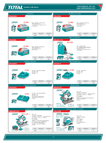 www.totalbusiness.comTOTAL TOOLS CO., PTE. LTD.www.totaltools.cn 01Unit Qty/Pack Qty/CtnPCS 1 5鋰電曲線鋸 線鋸機 單主機/20VTJSLI1008電壓:20V 空載轉速:3000rpm 切割能力: 木材:110mm 金屬:12mm 配有 5 個鋸片 電池和充電器單獨出售 彩盒包裝Unit Qty/Pack Qty/CtnPCS 1 1鋰電帶鋸機-雙4AUTBSLI201272電壓:20V 空載速度:0-120m/min 最大切割能力(矩形工件):127mmx127mm 最大切割能力(圓形工件):127mm 整合式工作燈 帶 1 個帶鋸條 帶鋸條尺寸:1141mmx13mmx0.65mm 帶 2 個 4.0Ah 電池組(TFBLI2002) 帶 1 個充電器(UTFCLI2001) 充電電壓:110-120V~50/60Hz 彩盒包裝Unit Qty/Pack Qty/CtnPCS 1 120V鋰電帶鋸機TBSLI20127電壓:20V 空載速度:0-120m/min 最大切割能力(矩形工件):127mmx127mm 最大切割能力(圓形工件):127mm 整合式工作燈 附 1 個帶鋸條 附鋸條尺寸:1141mmx13mmx0.65mm 電池和充電器單獨出售 彩盒包裝Unit Qty/Pack Qty/CtnPCS 1 2020V雙插充電器4.0AUTCLI2034輸入電壓:110-120V~50/60Hz 輸出電壓:21V 輸出電流:4A 最多可容納 2 個 P20S 電池組 雙活動電池連接埠可同時充電 彩盒包裝Unit Qty/Pack Qty/CtnPCS 1 2020V充電器(DC充頭)TFCLI2012輸入電壓:12-24V DC 輸出電壓:20V 輸出電流:2A 彩盒包裝Unit Qty/Pack Qty/CtnPCS 1 2020V鋰電充電器2.0AUTFCLI2001輸入電壓:110-120V~50/60Hz 輸出電壓:20V 輸出電流:2A 彩盒包裝Unit Qty/Pack Qty/CtnPCS 1 160A大容量電池背包TFBLI241110電壓:20V/20V+20V 容量:60.0Ah/30.0Ah(1080Wh) LED 電池電量指示燈 一顆電池適用於所有 P20S 多種工具, 採用彩盒包裝Unit Qty/Pack Qty/CtnPCS 1 206A鋰電電池TFBLI2060電壓:20V 鋰離子 6.0Ah 電池 LED 電池電量指示燈 適用於 P20S 多種工具 採用彩盒包裝Unit Qty/Pack Qty/CtnPCS 1 1220V鋰電電池包5.0AhTFBLI2053電壓:20V 鋰離子 5.0Ah 電池 LED 電池電量指示燈 適用於 P20S 多種工具 採用彩盒包裝Unit Qty/Pack Qty/CtnPCS 1 125A鋰電電池TFBLI20531電壓:20V 鋰離子 5.0Ah 電池組 LED 電池電量指示燈 一顆電池適用於所有 P20S 多種工具, 採用彩盒包裝17