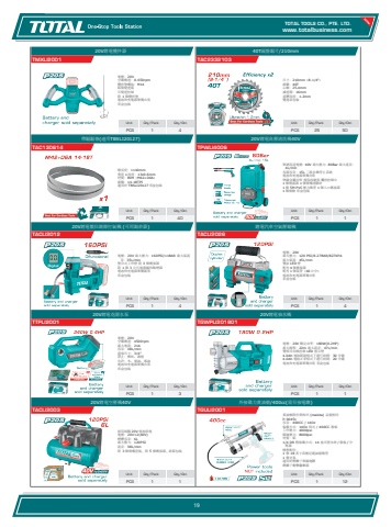 www.totalbusiness.comTOTAL TOOLS CO., PTE. LTD.www.totaltools.cn 01Unit Qty/Pack Qty/CtnPCS 1 12外接動力黃油槍/400cc(需另接電鑽)TGULI2001黃油槍附件與牧田 (makita) 品質相同: P-90451 容量:400CC / 14Oz 裝載方式:14Oz 筒式 / 400CC 散裝 工作壓力:4000psi 爆破壓力:8000psi 材質:鋁 1/4 DR 種裝載方式:14 盎司墨水匣 / 散裝 / 分配器 標準配件: 1 個 18 英寸高壓尼龍油脂軟管 1 個支架 適用於鋰離子無線電鑽 鋰離子衝擊驅動器 Unit Qty/Pack Qty/CtnPCS 1 120V鋰電空壓機40VTACLI2003採用兩顆 20V 電池供電 電壓:20V×2(40V) 槽體容量:6L 最大壓力:120PSI 流量:98L/min 附 3 個噴嘴套裝,附 5 個轉接器,紙箱包裝Unit Qty/Pack Qty/CtnPCS 1 120V鋰電抽水機TGWPLI201801電壓:20V 額定功率:180W(0.2HP) 最大揚程:22m 最大流量:47L/min 雙模式切換控制 LED 指示燈 4.0Ah 電池節能模式下運行時間:30 分鐘 4.0Ah 電池正常模式下運行時間:20 分鐘 電池和充電器單獨出售 彩盒包裝Unit Qty/Pack Qty/CtnPCS 1 320V鋰電花園水泵TTPLI2001電壓:20V 空載轉速:4500rpm 最大電流:21A 容量:48L/min 連接尺寸:3/4'' 禁止:燃料、酒精 允許:水、柴油、煤油 電池和充電器單獨出售 彩盒包裝Unit Qty/Pack Qty/CtnPCS 1 4鋰電汽車空氣壓縮機TACLI2026電壓:20V 最大壓力:120 PSI/8.27BAR/827KPA 最大氣流:45L/min 雙缸 LED 燈 配有 4 個轉接器 配有 1 個氣管(40 公分) 電池和充電器單獨出售 彩盒包裝Unit Qty/Pack Qty/CtnPCS 1 420V鋰電數位調節打氣機 (可用點菸器)TACLI2012電壓:20V 最大壓力:160PSI/11BAR 最大氣流量:35L/min 整合式工作燈 附 3 個轉接器 附 1 個 3 公尺電源線和點煙器 電池和充電器單獨販售 彩盒包裝Unit Qty/Pack Qty/CtnPCS 1 120V鋰電高壓清洗機40VTPWLI4006無刷馬達電壓:40V 最大壓力:80Bar 最大流量:4L/min 容器容量:15L 三級自動停止系統 電池和充電器單獨出售 伸縮金屬拉桿 後院收納架 觸控控制台 1 個噴霧器 1 個噴嘴清潔針 1 個 5M PVC 壓力軟管 1 個入口轉接器 1 個噴槍 彩盒包裝Unit Qty/Pack Qty/CtnPCS 1 40帶鋸鋸條(適用TBSLI20127)TAC130614總長度:1140mm 寬度 x 厚度:13x0.6mm 材質:BIM(M42+D6A) 齒數:14-18TPI 適用於 TBSLI20127 彩盒包裝Unit Qty/Pack Qty/CtnPCS 25 5040T圓盤鋸片/210mmTAC2332103尺寸:210mm(8-1/4\齒數:40T 心軸:25.4mm 減速環:16mm 基體厚度:1.2mm 雙泡罩包裝Unit Qty/Pack Qty/CtnPCS 1 420V鋰電攪拌器TMXLI2001電壓:20V 空載轉速:0-650rpm 攪拌墊螺紋:M14 鋁製變速箱 可變速控制 附 1 個攪拌墊 電池和充電器單獨出售 彩盒包裝19