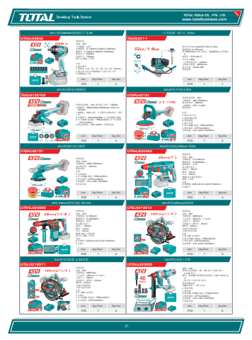www.totalbusiness.comTOTAL TOOLS CO., PTE. LTD.www.totaltools.cn 01Unit Qty/Pack Qty/CtnPCS 1 242v鋰電混凝土釘槍UTCNLI420602電壓:42V 緊固件長度範圍:19 - 40 毫米(3/4 英吋 - 1-5/8 英吋) 應用:將電纜和導管緊固到混凝土 C60 和鋼 6 毫米 (最大釘子長度 27 毫米) 無刷電機包括: 1000 個釘子(27 毫米) 1 個氣門嘴 1 個針腳 2 個 42V 2.5AH 電池(TFBLI42251) 1 個充電器(UTFCLI42021) 充電電壓:110-120V~50/60Hz 手提箱包裝Unit Qty/Pack Qty/CtnPCS 1 442v鋰電電圓鋸-2.5A單顆UTSLI4218511無刷馬達 電壓:20V 空載轉速:4800rpm 刀片直徑:185mm(7-1/4'') 心軸尺寸:20mm 切割能力:45°度:45mm 90°度:65mm 可調式切割深度 可調式斜角切割 包括: 2 件 185 毫米鋸片 1 件捲尺 1 件 2.5Ah 電池組(TFBLI42251) 1 件充電器(UTFCLI42021) Unit Qty/Pack Qty/CtnPCS 1 242v鋰電185mm圓鋸機UTSLI4218512無刷馬達 電壓:20V 空載轉速:4800rpm 刀片直徑:185mm(7-1/4'') 心軸尺寸:20mm 切割能力:45°度:45mm 90°度:65mm 可調式切割深度 可調式斜角切割 包括: 1 個 185 毫米鋸片 2 個 2.5Ah 電池組(TFBLI42251) 1 個充電器(UTFCLI42021) 充電電壓:110-120V~50/60Hz Unit Qty/Pack Qty/CtnPCS 1 242V-28mm鋰電電鎚-雙2.5AUTRHLI422882無刷馬達 電壓:42V 空載轉速:0-900rpm 衝擊速率:0-4400bpm 衝擊能量:4.5J 最大鑽孔能力: 混凝土:28mm 鋼材:13mm 木材:40mm SDS Plus 卡盤系統 整合式 LED 工作燈 包括: 6 件鑽頭(6/8/10/12/14/16*160mm) 2 件鑿子 Unit Qty/Pack Qty/CtnPCS 1 442v鋰電電鎚/26mm-雙2AUTRHLI422682無刷馬達 電壓:42V 空載轉速:0-1100rpm 衝擊速率:0-5000bpm 衝擊能量:2.5J 最大鑽孔能力: 混凝土:26mm 鋼材:13mm 木材:30mm SDS 加卡盤系統整合 LED 工作燈 包括: 6 個鑽頭(6/8/10/12/14/16*160mm) 2 個鑿子 Unit Qty/Pack Qty/CtnPCS 1 442v鋰電6吋拋光機組UTAPLI42151無刷馬達 電壓:42V 空載轉速:2000-4500rpm 拋光墊直徑:150mm 變速控制 包括: 3 件海綿墊 1 件 2.0Ah 電池(TFBLI42201) 1 件充電器(UTFCLI42021) 充電電壓:110-120V~50/60Hz 帆布袋包裝Unit Qty/Pack Qty/CtnPCS 1 442v鋰電7吋拋光機組UTAPLI42181無刷馬達電壓:42V 空載轉速:400-2500rpm 拋光墊直徑:180mm 主軸螺紋:5/8\變速控制 包括: 1 個 D 型手把 1 個鉤環拋光墊 2 個海綿墊 1 個羊毛墊 1 個 2.0Ah 電池(TFBLI42201) 1 個充電器(UTFCLI42021) 充電電壓:110-120V~50/60Hz Unit Qty/Pack Qty/CtnPCS 1 442v無刷鋰電砂輪機組TAGLI4128102無刷馬達電壓:42V 最大輸入功率:1280W 空載轉速:3000/6500/10000rpm 圓盤直徑:100mm 主軸螺紋:M10 包括:1 套磨料金屬切割片(25 件) 3 件翻蓋片(P40/P60/P80) 1 件超薄鑽石圓盤 2 件 2.5Ah 電池組(TFBLI42251) 1 件充電器(TFCLI42021) 充電包裝電池:220-240Hz 手提箱包裝Unit Qty/Pack Qty/CtnPCS 1 1二行程地鑽(動力)/52ccTEA55221-1額定功率 (cc./wattolt):52cc/1.4kw 螺旋轉速 :0-265/min 與 TEA55221-2 配合使用,TEA55221-2 單獨出售 進油管 : 雙層 PUR 管 火星塞 :NGK 二行程油箱容量:1200ml 引擎最大轉速:9000/min 最大怠速:3300±300 紙箱包裝Unit Qty/Pack Qty/CtnPCS 1 442v-鋰電600Nm衝擊扳手-單2AUTIWLI42602無刷馬達 電壓:42V 方形驅動:1/2\空載轉速:0-1700/0-2100/0-2300rpm 衝擊率:0-2400/0-2800/0-3300bpm 緊固扭力:600Nm 扭斷扭力:750Nm 整合式 LED 工作燈 包括: 1 個皮帶夾 7 個插座(14、15、17、19、21、22、24mm) 1 個 1/2 英吋方形驅動器至 1/4 英吋六角 2 個螺絲起子頭 21
