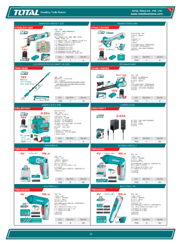 www.totalbusiness.comTOTAL TOOLS CO., PTE. LTD.www.totaltools.cn 01Unit Qty/Pack Qty/CtnPCS 5 204V直手柄起子機TSDLI04062電壓:4V 六角柄:1/4\空載轉速:260rpm 最大扭力:5N.m 整合式工作燈 充電電量指示器 透過 USB type-C 電纜充電(電纜單獨販售) 包括:40 個 25mm Cr-V 鑽頭 + 支架 1 個 50mm Cr-V 鑽頭 1 個 74mm Cr-V 鑽頭 1 個連接器 塑膠盒包裝Unit Qty/Pack Qty/CtnPCS 5 204V旋轉螺絲起子TSDLI04425電壓:4V 六角柄:1/4\空載速度:240rpm 最大扭力:4N.m 兩位置可調式手把 透過 USB type-C 電纜充電(電纜單獨販售) 整合式工作燈包括: 20 件 25mm Cr-V 批頭 + 支架 2 件 50mm Cr-V 批頭 + 支架 1 件 74mm Cr-V 批頭 1 個連接器 塑膠盒包裝Unit Qty/Pack Qty/CtnPCS 5 204V電動槍型螺絲起子TSDLI0442電壓:4V 六角柄:1/4\空載速度:240rpm 最大扭力:4Nm 兩位置可調式手把 透過 USB type-C 電纜充電(電纜單獨出售) 整合式 LED 工作燈包括: 16 件 25mm Cr-V 批頭 + 支架 2 件 50mm Cr-V 批頭 + 支架 1 件連接器 手提箱包裝Unit Qty/Pack Qty/CtnPCS 5 204V旋轉螺絲批TSDLI0458電壓:4V 六角柄:1/4\空載轉速:240rpm 最大扭力:4N.m 整合式工作燈包括: 8 件 25 毫米 Cr-V 批頭 + 支架 1 件連接器 透過 USB type-C 電纜充電(電纜單獨出售) 手提箱包裝Unit Qty/Pack Qty/CtnPCS 1 2012V鋰電充電器UTCLI12071輸入電壓:110-120V~50/60Hz 輸出電壓:12V 輸出電流:0.65A 彩盒包裝Unit Qty/Pack Qty/CtnPCS 1 412線綠光雷射水準儀UTLL301201綠色雷射水準儀 電壓:16V 工作範圍:0~35 m 自調平角度:≤4° 雷射等級 II:<1mW 調平精度:±1.5mm@7m 線路精度:±1.5mm@7m 個 360° 水準和 2 個 360° 垂直雷射線 工作溫度:0~+40℃ 儲存溫度:-10~+50℃ 包括: 1 個磁性可升降旋轉支架 1 個旋轉底座,帶 3 個可調腳位 1 個雷射目標板 Unit Qty/Pack Qty/CtnPCS 1 2鋰電16v鼓風機組UTABLI168082電壓:16V 空載轉速:0-13000rpm 平均風量:5m3/min 最大風速:50m/s 包括: 2 個 2.0Ah 電池組(TFBLI1620) 1 個 M16 充電器(UTFCLI1613) 充電電壓:110-120V~50/60Hz 彩盒包裝Unit Qty/Pack Qty/CtnPCS 1 12花剪果樹剪專用延長桿/16V用 (無本體)TERLI1658電壓:16V 機器總長度:1.7m-2.2m 包括:1 個肩帶 適用於 TSSLI16258/TSSLI162581/UTSSLI162581/TSSLI16258/UTSSLI162582 電池和充電器單獨出售 彩盒包裝Unit Qty/Pack Qty/CtnPCS 1 6M16鋰電果樹剪/20VUTSSLI162582無刷馬達電壓:16V 切割直徑:25mm 包括: 1 個油瓶(空) 1 塊磨刀石 1 個護套 2 個 2.0Ah 電池組(TFBLI1620) 1 個充電器(UTFCLI1613) 充電電壓:110-120V~50/60Hz 塑膠盒包裝Unit Qty/Pack Qty/CtnSET 1 416V鋰電磨切機套裝今夏版UTOSLI241299電壓:16V 空載轉速:5000-20000rpm 擺動角度:3.2° 6 檔調節包括: 10 件 80mm 砂紙(P60、P80、P120、P180、P240)x2 1 件 Delta 打磨墊,尺寸:80mm(3-1/8 英吋) 1 件 78mm 三角硬質合金灌漿去除銼刀 1 件 88mm 87mm Cr-V 鋸片 1 個 10x40mm Cr-V 鋸片 1 個 20x40mm Cr-V 鋸片 2 個 34x40mm Cr-V 鋸片 1 個 34x40mm 雙金屬(M42)鋸片 1 個 65x50mm 柔性雙金屬(M42)鋸片 23