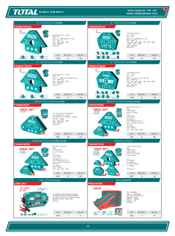 www.totalbusiness.comTOTAL TOOLS CO., PTE. LTD.www.totaltools.cn 01Unit Qty/Pack Qty/CtnSET 1 8電瓶夾/600AMPPBCA16008電流:600AMP 夾具尺寸:18x10cm 適用於排氣量≤4.5L 的汽車 電纜材質:銅包鋁 電纜外徑:10mm 電纜長度:3m 彩盒包裝Unit Qty/Pack Qty/CtnPCS 1 4110V 充電器/12V/24VUTBC1601輸入電壓 (V):110-120 頻率 (Hz):60 充電電壓 (V):12/24 額定電流 (A):8/5 提升電流 (A):12 參考容量 (Ah):32-150 絕緣等級:H 重量(kg):5.6 紙箱包裝Unit Qty/Pack Qty/CtnSET 5 107Pcs焊接定位器組套TAMWH7006 7 件磁性焊接支架套裝 規格: 2 個迷你磁鐵 2 個 3 吋磁鐵 2 個 3 吋多角度磁鐵 1 個 4 吋磁鐵 拉力: 迷你 10Lbs 3 吋 25Lbs 3 吋多角度 25Lbs 4 吋 50Lbs 每件產品尺寸: Unit Qty/Pack Qty/CtnSET 5 206Pcs焊接定位器組套/10LBS,25LBSTAMWH6002磁性焊接支架 6 件套 規格: 4 件迷你磁鐵 2 件 3 英寸磁鐵 拉力: 迷你 10 磅 3 英寸 25 磅 每件產品尺寸: 迷你 70*42.5*12 毫米 3 英寸 120*83*14.4 毫米 每件重量: 迷你 108 克 3 英寸 304 克 角度:45°、90°、135° Unit Qty/Pack Qty/CtnSET 5 204Pcs焊接定位器組套/10LBS,25LBSTAMWH4062磁性焊接支架 4 件套 規格: 2 個迷你磁鐵 2 個 3 英寸磁鐵 拉力: 迷你 10 磅 3 英寸 25 磅 每件產品尺寸: 迷你 70*42.5*12 毫米 3 英寸 120*83*14.4 毫米 每件重量: 迷你 108 克 3 英寸 304 克 角度:45°、90°、135° Unit Qty/Pack Qty/CtnSET 10 404Pcs迷你焊接定位器組套/10LBSTAMWH40014 件迷你磁性焊接支架套裝規格: 4 件迷你磁鐵拉力:10 磅 每件產品尺寸:70 * 42.5 * 12mm 每件重量:108g 角度:45°、90°、135° 材質:磁鐵和鋼 雙泡罩包裝Unit Qty/Pack Qty/CtnPCS 6 185\TAMWH75056多角度磁性焊接支架 拉力:75 磅 規格:5 吋 產品尺寸:144 * 110 * 25 公釐 重量:1008 公克 角度:30°、45°、60°、75°、90°、105°、120°、135°、150° 材質:磁鐵和鋼 雙泡罩包裝Unit Qty/Pack Qty/CtnPCS 6 185\TAMWH75052磁性焊接支架拉力:75 磅 規格:5 吋 產品尺寸:189.5*122.2*25.4 公釐 重量:1041 公克 角度:45°、90°、135° 材質:磁鐵和鋼 雙泡罩包裝Unit Qty/Pack Qty/CtnPCS 6 304\TAMWH50046多角度磁性焊接支架 拉力:50 磅 規格:4 吋 產品尺寸:178*90*17.2 公釐 重量:542 公克 角度:30°、45°、60°、75°、90°、105°、120°、135°、150° 材質:磁鐵和鋼 雙泡罩包裝Unit Qty/Pack Qty/CtnPCS 6 304\TAMWH50042磁性焊接支架拉力:50 磅 規格:4 吋 產品尺寸:155*102*17.4 公釐 重量:591 公克 角度:45°、90°、135° 材質:磁鐵和鋼 雙泡罩包裝33
