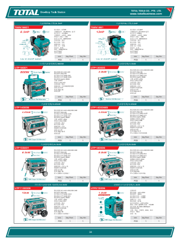 www.totalbusiness.comTOTAL TOOLS CO., PTE. LTD.www.totaltools.cn 01Unit Qty/Pack Qty/CtnPCS 1 1逆變靜音汽油發電機/1.2kWUTP515006逆變技術 額定電壓:110-120V 額定頻率:60Hz 最大輸出功率:1.2kW 額定輸出功率:1.0kW 啟動方式:反沖 額定電流:8.7A 純正弦波輸出(波動 ±3%) 雜訊(7m)@50% 負載:<62dB 運行時間 -8.3300-4800rpm 銅線圈發電機 引擎:單缸,四衝程,OHV,風冷 排氣量:56cc 油箱:3L Unit Qty/Pack Qty/CtnPCS 1 1四行程汽油發電機 電啟動/10.0kWUTP1100006額定電壓 (V):110-120/220-240 額定頻率 (Hz):60 最大輸出功率 (kW):10.0 額定輸出功率 (kW):8.5 額定轉速 (rpm):3600 引擎 :4 衝程 ,OHV 排氣量 (mL):457 冷卻系統 : 風冷 點火系統 :TCI 啟動系統 : 反沖 + 電 銅線圈交流發電機 油箱 (L):25 乾重 (kg):95 附 1 套輔助手把與輪子 Unit Qty/Pack Qty/CtnPCS 1 1汽油發電機/8.0kWUTP180006額定電壓 (V):110-120/220-240 額定頻率 (Hz):60 最大輸出功率 (kW):8.0 額定輸出功率 (kW):6.5 額定轉速 (rpm):3600 發動機 :4 衝程 ,OHV 排氣量 (mL):420 冷卻系統 : 風冷 點火系統 :TCI 啟動系統 : 反沖 + 電 銅線圈交流發電機 油箱 (L):25 乾重 (kg):89 帶 1 套輔助手柄和車輪 Unit Qty/Pack Qty/CtnPCS 1 1汽油發電機組/6.5kWUTP155001額定電壓 (V):110-120/220-240 額定頻率 (Hz):60 最大輸出功率 (kW):6.5 額定輸出功率 (kW):5.5 額定轉速 (rpm):3600 引擎 :4 衝程 ,OHV 排氣量 (mL):389 冷卻系統 : 風冷 點火系統 :TCI 啟動系統 : 反沖 + 電 銅線圈交流發電機 油箱 (L):25 乾重 (kg):78 附 1 套輔助手把與輪子 Unit Qty/Pack Qty/CtnPCS 1 1汽油發電機/4.65kWUTP140006ES額定電壓 (V):110-120/220-240 額定頻率 (Hz):60 最大輸出功率 (kW):4.65 額定輸出功率 (kW):3.5 額定轉速 (rpm):3600 發動機 :4 衝程 ,OHV 排氣量 (mL):208 冷卻系統 : 風冷 點火系統 :TCI 啟動系統 : 反沖 + 電 銅線圈交流發電機 油箱 (L):15 乾重 (kg):51.5 帶 1 套輔助手柄和發電機 Unit Qty/Pack Qty/CtnPCS 1 1汽油發電機/4.65kWUTP140006額定電壓 (V):110-120/220-240 額定頻率 (Hz):60 最大輸出功率 (kW):4.65 額定輸出功率 (kW):3.5 額定轉速 (rpm):3600 引擎 :4 衝程 ,OHV 排氣量 (mL):208 冷卻系統 : 風冷 點火系統 :TCI 啟動系統 : 反沖 銅線圈交流發電機 油箱 (L):15 乾重 (kg):42.5 紙箱包裝Unit Qty/Pack Qty/CtnPCS 1 1汽油發電機/3.0kWUTP130005額定電壓 (V):110-120/220-240 額定頻率 (Hz):60 最大輸出功率 (kW):3.0 額定輸出功率 (kW):2.8 額定轉速 (rpm):3600 引擎 :4 衝程 ,OHV 排氣量 (mL):210 冷卻系統 : 風冷 點火系統 :TCI 啟動系統 : 反沖 鋁線圈交流發電機 油箱 (L):15 乾重 (kg):42.5 紙箱包裝Unit Qty/Pack Qty/CtnPCS 1 1二行程汽油發電機組/800WUTP18001額定電壓 (V):110-120 額定頻率 (Hz):60 最大輸出功率 (kW):0.8 額定輸出功率 (kW):0.65 額定轉速 (rpm):3600 引擎 :2 衝程 排氣量 (mL):63 冷卻系統 : 風冷 啟動系統 : 反沖鋁線圈發電機 油箱 (L):4.0 乾重 (kg):16 紙箱包裝Unit Qty/Pack Qty/CtnPCS 1 1汽油TOTAL引擎/13HPTGEN1881最大輸出 :13.0HP 凸輪軸直徑 :25.4mm Q 型 最大扭力 :29Nm 引擎類型:4 衝程,OHV 排氣量(mL):389 缸徑 x 行程:88X64mm 冷卻系統:風冷 點火系統:TCI 啟動系統:反沖 油箱(L):6.0L 油容量:1.1L 油耗:280g/HP.hr 油量警報器 用作水運器Unit Qty/Pack Qty/CtnPCS 1 1汽油TOTAL引擎/6.5HPTGEN16821最大輸出:6.5HP 凸輪軸直徑:19.05mm,Q 型 最大扭力:12.4Nm 引擎類型:4 衝程,OHV 排氣量(mL):196 缸徑 x 行程:68X54mm 冷卻系統:風冷 點火系統:TCI 啟動系統:反沖 油箱(L):3.6L 油容量:0.6L 油耗:290g/HP.hr 油量警報器 用作水運器34
