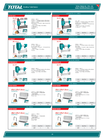 www.totalbusiness.comTOTAL TOOLS CO., PTE. LTD.www.totaltools.cn 01Unit Qty/Pack Qty/CtnSET 1 12門釘-40mmTAC918402訂書針尺寸:40mm 2500/ 彩盒 適用於 TAT81501、TCSNLI6005、TCSNLI6008 Ga18,1.25X1.0mm 釘冠 :5.7mm 彩色盒子包裝Unit Qty/Pack Qty/CtnSET 1 16門釘-38mmTAC918382訂書針尺寸:38mm 2500/ 彩盒 適用於 TAT81501、TCSNLI6005、TCSNLI6008 Ga18,1.25X1.0mm 釘冠 :5.7mm 彩色盒子包裝Unit Qty/Pack Qty/CtnSET 1 16門釘-35mmTAC918352訂書針尺寸:35mm 2500/ 彩盒 適用於 TAT81501、TCSNLI6005、TCSNLI6008 Ga18,1.25X1.0mm 釘冠 :5.7mm 彩色盒子包裝Unit Qty/Pack Qty/CtnSET 1 16門釘-25mmTAC918252訂書針尺寸:25mm 2500/ 彩盒 適用於 TAT81501、TCSNLI6005、TCSNLI6008 Ga18,1.25X1.0mm 釘冠 :5.7mm 彩色盒子包裝Unit Qty/Pack Qty/CtnPCS 1 20氣動釘槍/鋼釘槍ST64TAT83301-3負載能力:100 件 布拉德尺寸:10-30mm Ga18,1.25x1.00mm 無安全板機 僅配備 Nitto 型連接器。 工作壓力:0.4-0.7Mpa(60-100Psi) 彩盒包裝Unit Qty/Pack Qty/CtnPCS 1 20直釘槍/F10-30mmTAT83322-3負載能力:100 件 布拉德尺寸:10-30mm Ga18,1.25x1.00mm 無安全板機 僅配備 Nitto 型連接器。 工作壓力:0.4-0.7Mpa(60-100Psi) 彩盒包裝Unit Qty/Pack Qty/CtnPCS 1 20氣動F30直釘槍TAT83301負載能力:100 件 布拉德尺寸:10-30mm Ga18,1.25x1.00mm 帶安全扳機 帶歐式連接器、美式連接器、Nitto 型連接器和義大利型連接器。 工作壓力:0.4-0.7Mpa(60-100Psi) 彩盒包裝Unit Qty/Pack Qty/CtnPCS 1 6氣動釘槍/鋼釘槍ST64TAT8641負載能力:70 件 釘子長度:18-64 mm 釘子直徑:φ2.2 mm 附歐式連接器、美式連接器、日東型連接器和義大利型連接器。 工作壓力:5-8bar(75-116Psi) 彩盒包裝Unit Qty/Pack Qty/CtnPCS 1 5氣動F50釘槍 (有安全觸發)TAT83501承重:100 布拉德尺寸:15-50mm Ga18,1.25x1.00mm 快速釋放鼻夾,可快速清除阻塞物。 配有歐式連接器、美式連接器、日東連接器和義大利連接器。 工作壓力:0.4-0.7Mpa(60-100Psi) 含 1000 個釘子,彩盒包裝Unit Qty/Pack Qty/CtnPCS 1 52合1氣動釘槍TAT81501負載能力:100 件 布拉德尺寸:15-50mm Ga18,1.25X1.0mm 訂書釘尺寸:16-40mm Ga18,1.25X1.0mm 訂書釘冠:5.7mm 附歐式連接器、美式連接器、Nitto 型連接器和義大利型連接器。 工作壓力:0.4-0.7Mpa(60-100Psi) 含 1000 顆釘子 含 200 顆釘子釘 彩盒包裝39