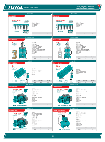 www.totalbusiness.comTOTAL TOOLS CO., PTE. LTD.www.totaltools.cn 01Unit Qty/Pack Qty/CtnPCS 1 10.5HP水泵浦UTWP13706A-24外圍幫浦 電壓:110-120V~60Hz 額定功率:370W(0.5HP) 最大揚程:35m 最大流量:35L/min 最大吸力:8m 管徑:1“x1” 銅線馬達 不鏽鋼焊接軸:304+45# 電泳幫浦體 黃銅葉輪 0.3m 長電纜 附 1 個壓力開關 附 24L 壓力罐 Unit Qty/Pack Qty/CtnPCS 1 11HP水泵浦UTWP17506外圍幫浦 電壓:110-120V~60Hz 額定功率:750W(1.0HP) 最大揚程:52m 最大流量:50L/min 最大吸力:8m 管徑:1“x1” 銅線馬達 不鏽鋼焊接軸:304+45# 電泳泵體 黃銅葉輪 0.3m 長電纜 紙箱包裝Unit Qty/Pack Qty/CtnPCS 1 10.75HP水泵浦UTWP15506外圍幫浦 電壓:110-120V~60Hz 額定功率:550W(0.75HP) 最大揚程:45m 最大流量:45L/min 最大吸力:8m 管徑:1“x1” 銅線馬達 不鏽鋼焊接軸:304+45# 電泳泵體 黃銅葉輪 0.3m 長電纜 紙箱包裝Unit Qty/Pack Qty/CtnPCS 1 60.5HP水泵浦UTWP13706外圍幫浦 電壓:110-120V~60Hz 額定功率:370W(0.5HP) 最大揚程:35m 最大流量:35L/min 最大吸力:8m 管徑:1“x1” 銅線馬達 不鏽鋼焊接軸:304+45# 電泳泵體 黃銅葉輪 0.3m 長電纜 彩盒包裝Unit Qty/Pack Qty/CtnPCS 5 2510M風管THT11101-3材質:PU 長度:10M 僅適用於 Nitto 型連接器。 內徑:5mm 外徑:8mm 收縮包裝Unit Qty/Pack Qty/CtnPCS 25 505M風管THT11051-3材質:PU 長度:5M 僅適用於 Nitto 型連接器。 內徑:5mm 外徑:8mm 收縮包裝Unit Qty/Pack Qty/CtnPCS 1 1氣動黃油桶/45LTHT118452容量:45L 桶應用:365*430mm 壓力比:50:1 工作壓力:6-8bar 最大自由流量:850g/min 最大流體壓力:400bar 汽缸直徑:70mm 空氣消耗量:250L/min@6.2bar 1/4\油脂管:5M 重量:21KG 紙箱包裝Unit Qty/Pack Qty/CtnPCS 1 1氣動黃油桶/30LTHT118302容量:30L 桶應用:330*430mm 壓力比:50:1 工作壓力:6-8bar 最大自由流量:850g/min 最大流體壓力:400bar 汽缸直徑:70mm 空氣消耗量:250L/min@6.2bar 1/4\油脂管:5M 重量:15KG 紙箱包裝Unit Qty/Pack Qty/CtnSET 1 1038mm鋼釘TAC02381長度:38 毫米 每盒數量:1000 個 直徑:2.9 毫米 材質:60# 鋼 彩盒包裝Unit Qty/Pack Qty/CtnSET 1 1032mm鋼釘TAC02321長度:32 毫米 每盒數量:1000 個 直徑:2.9 毫米 材質:60# 鋼 彩盒包裝40