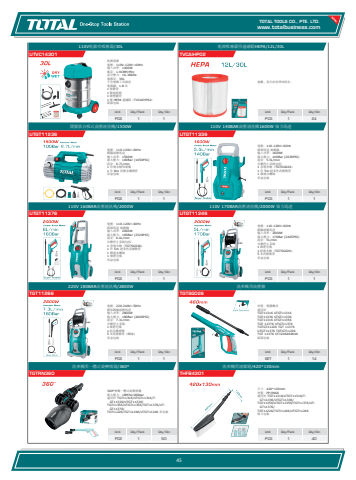 www.totalbusiness.comTOTAL TOOLS CO., PTE. LTD.www.totaltools.cn 01Unit Qty/Pack Qty/CtnPCS 1 40洗車機用清潔刷/420*130mmTHFB4301尺寸:420*130mm 材質:PP/PA66 適用於 TGT11316/UTGT11316/TGT11336/UTGT11336/ TGT11356/UTGT11356/TGT11376/UTGT11376/ TGT11226/TGT11246/UTGT11246 紙卡包裝Unit Qty/Pack Qty/CtnPCS 1 50洗車機用一體式旋轉噴頭/360°TGTRN360360°噴嘴一體式旋轉噴嘴 最大壓力:18MPa/180bar 適用於 TGT11316/UTGT11316/TGT11336/UTGT11336/ TGT11356/UTGT11356/TGT11376/UTGT11376/ TGT11226/TGT11246/UTGT11246 彩包裝Unit Qty/Pack Qty/CtnSET 1 14洗車機用高壓槍TGTSG026材質:塑膠機身 適用於 TGT11316 UTGT11316 TGT11336 UTGT11336 TGT11316 UTGT11356 TGT 11376 UTGT11376 TGTGT11226 TGT 11376 UTGT11376 TGTGT11226 TGT 11376 UT1246464646 紙箱包裝Unit Qty/Pack Qty/CtnPCS 1 1220V 180BAR高壓清洗機/2800WTGT11266電壓:220-240V~50Hz 銅泵銅線感應馬達 輸入功率:2800W 最大壓力:180Bar (2600PSI) 流量:7.3L/min 自動停止系統 1 個肥皂瓶 1 組金屬噴槍 5 米高壓軟管(鋼絲) 彩盒包裝Unit Qty/Pack Qty/CtnPCS 1 1110V 170BAR高壓清洗機/2000W 強力馬達UTGT11246電壓:110-120V~60Hz 銅線感應馬達 輸入功率:2000W 最大壓力:170Bar (2465PSI) 流量:5L/min 自動停止系統 1 個肥皂瓶 1 組噴水槍(TGTSG026) 5 米高壓軟管 彩盒包裝Unit Qty/Pack Qty/CtnPCS 1 1110V 160BAR高壓清洗機/2000WUTGT11376電壓:110-120V~60Hz 碳刷馬達 純銅線 輸入功率:2000W 最大壓力:160Bar (2320PSI) 流量:6.0L/min 自動停止系統包括: 1 套噴水槍(TGTSG026) 1 件 5m 超柔性高壓軟管 1 個進水螺絲 1 個肥皂瓶 彩盒包裝Unit Qty/Pack Qty/CtnPCS 1 1110V 140BAR高壓清洗機1600W 強力馬達UTGT11336電壓:110-120V~60Hz 碳刷馬達 純銅線 輸入功率:1600W 最大壓力:140Bar (2030PSI) 流量:5.5L/min 自動停止系統包括: 1 套噴水槍(TGTSG026) 1 件 5m 超柔性高壓軟管 1 個進水螺絲 彩盒包裝Unit Qty/Pack Qty/CtnPCS 1 1開發款自吸式高壓清洗機/1500WUTGT11236電壓:110-120V~60Hz 銅線感應馬達 輸入功率:1500W 最大壓力:100Bar (1450PSI) 流量:6.7L/min 1 件噴水槍和噴嘴 1 件 8m 高壓金屬軟管 彩盒包裝Unit Qty/Pack Qty/CtnPCS 1 24乾溼吸塵器用過濾眠HEPA/12L/30LTVCAIHP02抱歉,我无法处理该请求。Unit Qty/Pack Qty/CtnPCS 1 1110V乾濕吹吸塵器/30LUTVC14301乾濕清潔 電壓:110V-120V~60Hz 輸入功率:1400W 風量:1.9CBM/Min 真空壓力:16-18KPa 集塵量:30L 不含電動工具插座 電源線:1.8 米 1 根軟管 1 個地板刷 1 個塑膠管 1 個 HEPA 過濾器(TVCAIHP02) 紙箱包裝45