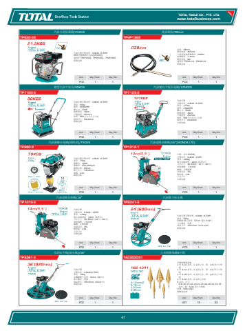 www.totalbusiness.comTOTAL TOOLS CO., PTE. LTD.www.totaltools.cn 01Unit Qty/Pack Qty/CtnSET 15 30六角柄階梯鑽5件組TACSD2051件階梯鑽頭套裝 1 件 4-12 毫米,1 毫米 / 步,柄:1/4 英寸六角柄 1 件 4-12 毫米,2 毫米 / 步,柄:1/4 英寸六角柄 1 件 6-18 毫米,2 毫米 / 步,柄:1/4 英寸六角柄 1 件 4-22 毫米,2 毫米 / 步柄 6 毫米,尺寸:6-8-10-13-16-19-21-23-26-29-31-33-35 毫米,柄:5/16 英寸六角柄 材質:HSS 4341 塑膠盒包裝Unit Qty/Pack Qty/CtnPCS 1 1水泥抹平機(漫光機)/36\TP9361-2汽油引擎 引擎功率:4.8kW(6.5HP) 重量:78kg 含鐵鍋轉子直徑:91cm(36 吋) 葉片數量:四個 成品葉片:35X15cm(6X14 吋) 紙箱包裝Unit Qty/Pack Qty/CtnPCS 1 1汽油動力抹光機TP9241-2汽油引擎引擎功率:4.8kW(6.5HP) 重量:56kg 附鐵盤 轉子直徑:57cm(22-7/16\刀片數量:四個 成品刀片:23X12cm(9*4-3/4\紙箱包裝Unit Qty/Pack Qty/CtnPCS 1 1汽油道路切割機/16\TP1016-2汽油引擎 引擎功率:9.6kW(13HP) 重量:120kg 最大切割深度:14cm(5.5 吋) 刀片尺寸:30-45cm(12 吋 -18 吋) 深度調整:手柄旋轉 驅動:手動推動 水箱容量:35L 燃料箱:2.8L 不含刀片 木箱包裝Unit Qty/Pack Qty/CtnPCS 1 1汽油道路切割機/16″(HONDA引擎)TP1016-1引擎:本田 GX390 引擎功率:9.6kW(13HP) 重量:120kg 最大切割深度:14cm(5.5 吋) 刀片尺寸:30-45cm(12 吋 -18 吋) 深度調整:手柄旋轉 驅動:手動推動 水箱容量:35L 燃料箱:2.8L 不含刀片 木箱包裝Unit Qty/Pack Qty/CtnPCS 1 1汽油衝擊夯地機(跳跳虎)/75KGSTP880-2汽油引擎引擎功率:4.8kW(6.5HP) 重量:79kg 衝擊力:10kN 衝擊率:450-660rpm 跳程行程:65mm 鞋子尺寸:33X29cm 油箱:2.0L 紙箱包裝Unit Qty/Pack Qty/CtnPCS 1 1汽油雙向平板夯地機/125KGSTP7125-2汽油引擎 引擎功率:4.8kW(6.5HP) 重量:127kg 頻率:4300VPM 離心力:25kN 壓實深度:30cm 行進速度:25cm/s 效率:500 平方公尺 / 小時 板材尺寸:63x40cm 木箱包裝Unit Qty/Pack Qty/CtnPCS 1 1輕型汽油平板夯/90KGSTP7100-2汽油引擎引擎功率:4.8kW(6.5HP) 重量:90kg 頻率:4200VPM 離心力:15kN 壓實深度:30cm 行進速度:45cm/s 效率:660 平方公尺 / 小時 板材尺寸:56x44cm 紙箱包裝Unit Qty/Pack Qty/CtnPCS 1 1純振動棒/38mmTPVP1382直徑:38mm 頭部長度:465mm 六角型接頭振動頻率:200Hz 振動幅度:1.2mm 軟管長度:6m 適用於 TP630-12、TP630-22 紙箱包裝Unit Qty/Pack Qty/CtnPCS 1 1汽油水泥振動機/21KGSTP630-22汽油引擎引擎功率:4.0kW(5.5HP) HEX 型聯軸器不包括振動器撲克 適用於 TPVP1382、TPVP1452、TPVP1602 紙箱包裝47