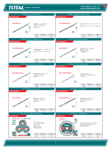 www.totalbusiness.comTOTAL TOOLS CO., PTE. LTD.www.totaltools.cn 01Unit Qty/Pack Qty/CtnPCS 25 50TCT圓盤鋁钜片/210mm/60TTAC233523210mm(8-1/4\16mm 和 25.4mm 環適用於斜切鋸 適用於產品 TS42142101 鋁切割雙泡罩包裝Unit Qty/Pack Qty/CtnSET 15 30超薄片TCT木工圓盤鋸片套裝/165mmTAC2361653 件 / 套 尺寸:165 毫米(6-1 / 2 吋) 齒數:24T / 40T / 60T 心軸:20 毫米 減速環:16 毫米 矩陣厚度:1.0 毫米 木材切割雙泡罩包裝Unit Qty/Pack Qty/CtnPCS 1 565型HEX鑿子/28*520*35TAC15342811228X35X520mm,扁平,六角鑿 耐磨,硬度高,使用壽命長 用於混凝土,磚牆,水泥 塑膠管包裝Unit Qty/Pack Qty/CtnPCS 1 565型重型HEX鑿子/28*520mmTAC1534281128X520mm,尖頭,六角鑿 耐磨,硬度高,使用壽命長 用於混凝土,磚牆,水泥 塑膠管包裝Unit Qty/Pack Qty/CtnPCS 1 1065型Hex平鑿/30 X400X 100mmTAC1533301330 X400X 100mm 扁平 適用於產品 TH215456 TH217506 \Unit Qty/Pack Qty/CtnPCS 1 1065型重型Hex平鑿/30 X400X 35mmTAC1533301230 X400X 35mm,扁平,六角鑿 耐磨,硬度高,使用壽命長 用於混凝土,磚牆,水泥 塑膠管包裝Unit Qty/Pack Qty/CtnPCS 1 1065型重型Hex尖鑿/30X 400mmTAC1533301130X400mm,尖頭,六角鑿耐磨, 硬度高,使用壽命長 用於混凝土,磚牆, 水泥塑膠管包裝Unit Qty/Pack Qty/CtnPCS 1 25五溝SDS max扁鑿/18 X400X 25mmTAC1522182118 X400X 25mm,扁平,SDS 最大耐磨,硬度高,使用壽命長 用於混凝土,磚牆,水泥用塑膠衣架包裝Unit Qty/Pack Qty/CtnPCS 1 25五溝SDS max扁鑿/18 X300X 25mmTAC1522181118 X300X 25mm,扁平,SDS 最大耐磨,硬度高, 使用壽命長用於混凝土,磚牆,水泥用塑膠衣架包裝Unit Qty/Pack Qty/CtnPCS 1 25五溝SDS max尖鑿/18*400mmTAC152118218X400mm,尖頭,SDS max 耐磨,硬度高,使用壽命長 用於混凝土,磚牆,水泥 用塑膠衣架包裝51