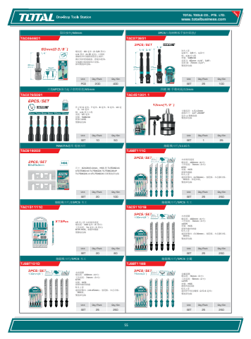 www.totalbusiness.comTOTAL TOOLS CO., PTE. LTD.www.totaltools.cn 01Unit Qty/Pack Qty/CtnSET 25 250線鋸機刀片/5PCS 金屬TJSBT118B金屬基礎 總長度:76mm(3 吋) 工作長度:50mm(2 吋) 12TPI 材質:HSS 銑削和波浪齒 5 件 / 套 適用於中厚金屬板(2.5-6 毫米) 雙泡罩包裝Unit Qty/Pack Qty/CtnSET 25 250線鋸機刀片/5PCS 木工TJSBT101D木材清潔 總長度:100mm(4 吋) 工作長度:74mm(3 吋) 6TPI 材質:HCS 研磨和錐形磨齒 5 件 / 套 適用於軟木(10-45mm)、刨花板、木芯合板、纖維板, 雙泡罩包裝Unit Qty/Pack Qty/CtnSET 25 250線鋸機刀片/5PCS 木工TAC51101B木材清潔 總長度:100mm(4 吋) 工作長度:74mm(3 吋) 10TPI 材質:HCS 研磨和錐形磨齒 5 件 / 套 適用於軟木(3-30mm)、刨花板、木芯膠合板、纖維板, 雙泡罩包裝Unit Qty/Pack Qty/CtnSET 20 80線鋸機刀片/15PCS 木工TAC151111C15 件 / 套 木材專用速度 總長度:100 毫米(4 英吋) 工作長度:74 毫米(3 英吋) 8TPI HCS,磨齒和側齒 塑膠盒包裝Unit Qty/Pack Qty/CtnSET 25 250線鋸機刀片/111C木TJSBT111C木材專用速度 總長度:100mm(4 吋) 工作長度:74mm(3 吋) 8TPI 材質:HCS 研磨和側齒 5 件 / 套 適用於軟木(4-50mm)、刨花板、木芯膠合板、纖維板、快速切割, 雙泡罩包裝Unit Qty/Pack Qty/CtnSET 20 100MAKITA通用 電刨刀片TAC618202尺寸:82X29X3.0mm,HSS 與 TL5508216 UTL5508216 TL7508226 TL7508226UP TL7508226-4 UTL7508226 匹配雙泡罩包裝Unit Qty/Pack Qty/CtnSET 1 25四溝 轉 手動夾頭/13mmTAC451301.1卡盤容量:1.5-13mm 連接尺寸:1/2“-20UNF 包含 1 個轉接器 雙泡罩包裝Unit Qty/Pack Qty/CtnSET 10 50六角6PCS強力起子套筒組套/65mmTAC2765061件 / 組 6 毫米、7 毫米、8 毫米、9 毫米、10 毫米、12 毫米 柄:1/4 英寸六角 長度:65 毫米 材質:50BV30 附強力磁鐵 塑膠盒包裝Unit Qty/Pack Qty/CtnSET 25 1003PCS六角柄轉板手接杆組套/TAC2736513 件 / 套 1/4 吋、3/8 吋、1/2 吋 柄:1/4 吋六角 材質:50BV30 長度 I:65mm(1/4\長度 II:73mm(1/2\雙泡罩包裝Unit Qty/Pack Qty/CtnPCS 200 400限位接杆/60mmTAC464601總長度:60 毫米(2-3/8 英吋) 1/4 英吋(6.35 毫米)六角柄 強磁性和可調節深度停止設計。 廣泛用於搭建露臺、搭建木框架、 安裝膠合板地板和石膏板。 採用雙泡罩包裝。55