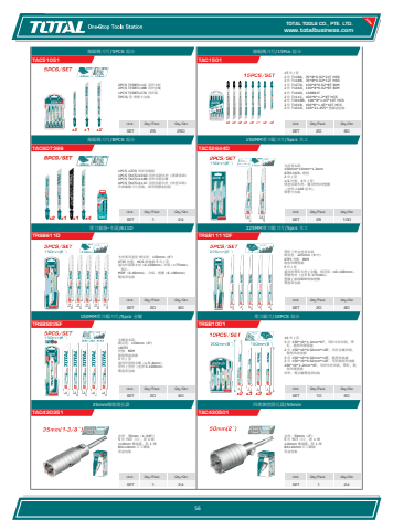 www.totalbusiness.comTOTAL TOOLS CO., PTE. LTD.www.totaltools.cn 01Unit Qty/Pack Qty/CtnSET 1 24四溝牆壁開孔器/50mmTAC430501直徑:50mm(2\5 件 TCT 刀片,附 1 個 110mm 轉接器,附 1 個 8X110mm 石工鑽頭 彩盒包裝Unit Qty/Pack Qty/CtnSET 1 2435mm鋼筋開孔器TAC430351直徑:35mm(1-3/8\5 件 TCT 刀片,附 1 個 110mm 轉接器,附 1 個 8X110mm 石工鑽頭 彩盒包裝Unit Qty/Pack Qty/CtnSET 10 60軍刀鋸片/10PCS 綜合TRSB100110 件 / 套 3 件 150*19*1.2mm*6T,用於木材切割,帶釘,銑削和側置齒 2 件 150*19*0.92mm*18T,用於金屬切割,銑削和波浪齒 3 件 150*19*0.92mm*10T,銑削和波齒 3 件 150*19*0.92mm*10T,用於銑削和波齒 200*19*1.2mm*6T,用於木材切割,帶釘,銑削和側置齒 材料:雙金屬雙泡罩包裝Unit Qty/Pack Qty/CtnSET 20 80150MM軍刀鋸刀片/5pcs 金屬TRSB922EF金屬基本款 總長度:150mm(6\18TPI 材質:BIM 銑削與波浪齒 5 件 / 套 適用於薄板金屬(1.5-4mm)、 管材 / 型材(直徑 5-100mm) 雙泡罩包裝Unit Qty/Pack Qty/CtnSET 20 80225MM軍刀鋸刀片/5pcs 木工TRSB1111DF帶釘子的木材基本款 總長度:225mm(9 吋) 6TPI 材質:BIM 銑削和側置齒 5 件 / 套 適用於帶釘木材 / 金屬、刨花板(10-100mm)、 塑膠型材(直徑 5-175mm)、 塑膠 / 玻璃纖維增強塑膠 雙泡罩包裝Unit Qty/Pack Qty/CtnSET 20 80軍刀鋸條-木頭/611DTRSB611D木材專用速度 總長度:150mm(6\6TPI 材質:HCS 磨邊齒 5 件 / 套 適用於建築木材(6-100mm)、木板(<75mm)、板片、 MDF(6-60mm)、合板、塑膠(6-100mm) 雙泡罩包裝Unit Qty/Pack Qty/CtnSET 25 100150MM軍刀鋸刀片/5pcs 木工TAC52644D木材基本款 150mm*19mm*1.2mm 6TPI-HCS- 銑削 2 件 / 套 1/2 吋柄,2 件 / 套, 快速切割木材、複合材料和塑膠 (直徑 <100 毫米), 吸塑卡包裝Unit Qty/Pack Qty/CtnSET 1 24線鋸機刀片/8PCS 綜合TACSD73861PCS 127D 用於切割鋁 1PCS TAC51101D 用於切割木材(清潔表面) 2PCS TAC51118B 用於切割金屬 4PCS TAC51111C 用於切割木材(快速切割) 件曲線鋸刀片套裝,採用塑膠盒包裝Unit Qty/Pack Qty/CtnSET 20 80線鋸機刀片/15Pcs 綜合TAC150115 件 / 套 2 件 T118A,76*8*0.92*21T HSS 2 件 T118B,76*8*0.92*12T HSS 1 件 T127D,100*8*0.92*8T BIM 2 件 T144D,100*8*0.92*8T BIM 2 件 T144D,106881T 2 件 T111C,100*8*1.2*8T HCS 2 件 T101BR,100*8*1.45*10T HCS 2 件 T101B,100*8*1.45*10T HCS 2 件 T101D,100*21.455* 塑膠盒包裝Unit Qty/Pack Qty/CtnSET 25 250線鋸機刀片/5PCS 綜合TAC510512PCS TJSBT111C 用於木材 2PCS TJSBT118B 用於金屬 1PCS TJSBT127D 用於鋁 5PCS/ 套 吸塑卡包裝56