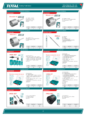 www.totalbusiness.comTOTAL TOOLS CO., PTE. LTD.www.totaltools.cn 01Unit Qty/Pack Qty/CtnSET 10 607件碳鋼孔鋸套裝TACSH30717 件套孔鋸套裝尺寸: 26、32、38、45、50、56、63mm 高度:50mm(2 吋) 雙泡罩包裝Unit Qty/Pack Qty/CtnSET 10 60孔鋸開鎖套裝/3Pcs/setTACSH1031件 / 組 1 件 54 毫米碳鋼孔鋸 1 件 3/8 英吋孔鋸心軸 1 件 7/8 英吋扁木鑽頭 雙泡罩包裝Unit Qty/Pack Qty/CtnSET 1 10雙金屬孔鋸/13件套TACSH013213 件雙金屬孔鋸組 材質:HSS M3 雙金屬 尺寸:19mm(3/4\(1-1/8\(1-1/2\(2\寸:9/16\1 件心軸:7/16\1-1/4\1 件帶 1/2-20 螺紋的適配器心軸,適用於孔鋸5/8-18 1 件六角形板扳手 1 件六角鑽 塑膠盒包裝Unit Qty/Pack Qty/CtnSET 1 10雙金屬開孔器套組TACSH0092件雙金屬孔鋸套裝 材質:HSS M3 雙金屬 尺寸:22mm(7/8 英吋)/29mm(1-1/8 英吋)/35mm(1-3/8 英吋)/44mm(1-3/4 英吋)/51mm(2 英吋)/64mm(2-1/2 英吋) 1 件六角尺寸 1 件心軸:7/16 英吋六角柄,適合尺寸:1-1/4 英吋 ~8-17/64 英吋 1 件轉接器心軸,附 1/2-20 螺紋,適用於孔鋸5/8-18 螺紋 塑膠盒包裝Unit Qty/Pack Qty/CtnSET 1 109件金屬孔鋸TACSH0091件雙金屬孔鋸組 材質:HSS M3 雙金屬 尺寸:19mm(3/4\(1-1/8\(1-3/4\1 件心軸:38\9/16\1 件心軸:7/16\1-1/4\1 件轉接器心軸,附 1/2-20 螺紋,適用於孔鋸5/8-18 螺紋 塑膠盒包裝Unit Qty/Pack Qty/CtnSET 10 40雙金屬孔鋸套裝TACSH1071件雙金屬孔鋸套裝尺寸: 19mm(3/4\(1-1/8\1 件轉接座:1/2\1 件轉接器:1/2\六角柄,適合尺寸:9/16\雙泡罩包裝Unit Qty/Pack Qty/CtnPCS 1 30牆壁開孔器接桿/350mmTAC43A13501柄:SDS Plus 螺紋:M22 長度:350mm 附 1 個 8X110mm 鑽頭 適用於產品 TAC430501 TAC430651 TAC430801 TAC431001 塑膠管包裝Unit Qty/Pack Qty/CtnSET 1 12四溝牆壁開孔器/100mmTAC431001直徑:100mm(4 吋) 10 個 TCT 刀片,附 1 個 110mm 轉接器, 附 1 個 8X110mm 石工鑽頭 彩盒包裝Unit Qty/Pack Qty/CtnSET 1 24四溝牆壁開孔器/80mmTAC430801直徑:80mm(3-1/8\8 片 TCT 刀片,附 1 個 110mm 轉接器, 附 1 個 8X110mm 石工鑽頭 彩盒包裝Unit Qty/Pack Qty/CtnSET 1 24四溝牆壁開孔器/65mmTAC430651直徑:65mm(2-9/16\8 片 TCT 刀片,附 1 個 110mm 轉接器,附 1 個 8X110mm 石工鑽頭 彩盒包裝57