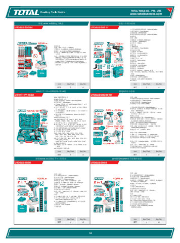 www.totalbusiness.comTOTAL TOOLS CO., PTE. LTD.www.totaltools.cn 01Unit Qty/Pack Qty/CtnSET 1 420V鋰電400NM板手組雙件套組UTOSLI23048電壓:20V 附 1 個無線衝擊扳手(TIWLI20401) 附 1 個工作燈(TWLI35261) 無線衝擊扳手(TIWLI20401): 無刷馬達 方形驅動器:1/2“ 空載轉速:0-1600 / 0-1900 / 0-2300rpm 衝擊率:0-2100 / 0-2500 / 0-2900b 工作扭力 工作燈(TWLI35261) 使用鋰聚合物可充電電池 流明:最大:300±10% 低:75±10% LED 功率耗散:3.5W 包括: 1 件 USB 充電線 10 件 1/2“ DR。衝擊套筒組 1 件 1/2\10 件 PH2+SL6.0 65mm 螺絲起子頭 2 件 2.0Ah 電池組 (TFBLI20011) 1 件充電器 (UTFCLI2001) 充電電壓:110-12000Hz/1200Hz 200Hz/120Hz。Unit Qty/Pack Qty/CtnSET 1 4鋰電405N.m震動扳手+工作燈套UTOSLI23056電壓:20V 附 1 個鋰電震動扳手(TIWLI20451) 附 1 個工作燈(TWLI043006) 鋰電震動扳手(TIWLI20451): 無刷馬達 電壓:20V 方形驅動器:1/2“ 空載轉速:0-1800 / 0-2000 / 0-2400rpm 衝擊率:0-2200 / 0-2600 / 00rpm 衝擊速率:0-2200 / 0-2600 / 00rpm 扭力 LED 工作燈(TWLI043006) 使用鋰聚合物可充電電池 流明:最大:300±10% 低:75±10% LED 功率耗散:3.5W 包括: 1 件 USB 充電線 10 件 1/2“ DR。衝擊套筒組 1 件 1/2\PH2+SL6.0 65mm 螺絲起子頭 2 件 2.0Ah 電池組 (TFBLI20011) 1 件充電器(UTFCLI2001) 充電電壓:110-1200Hz 手提箱包裝Unit Qty/Pack Qty/CtnSET 1 2鋰電5件組合套裝UTOSLI25069210電壓:20V 1 個緊湊型無刷鋰電震動電鑽(TIDLI206681) 1 個鋰電衝擊起子(TIRLI20281) 1 個鋰電角磨機(TAGLI27103) 1 個鋰電工作燈(TWLI2088) 小型無刷鋰電震動電鑽(TIDLI206681): 無刷馬達 空載轉速:0-500/0-2000rpm 最大衝擊率:30000bpm 最大扭力:66Nm 金屬卡盤 卡盤容量:13mm 扭力設定:22+1+1 機械式工作速 LED 鋰電衝擊起子機(TIRLI20281): 無刷馬達 電壓:20V 六角柄:6.35mm 空載轉速:0-1600/0-1900/0-2600rpm 衝擊率:0-2100/0-2500/0-2900brpm 鋰電角磨機(TAGLI27103): 無刷馬達 電壓:20V 最大輸入功率:1000W 空載速度:3000/6000/9000rpm 圓盤直徑:4'' 主軸螺紋:M10 鋰電工作燈(TWLI2088): 1.20V 中:1400±10% 低:800±10% 3 種亮度模式 金屬架 符合人體工學的軟握把 超長照射距離 LED 燈頭可旋轉 130°度 鋰電工作燈(TWLI043006): 使用鋰聚合物可充電電池 流明:最大:300±10% 低:75±8 手把採用磁性底座,可輕鬆附著在金屬表面 使用鋰聚合物可充電電池 Unit Qty/Pack Qty/CtnSET 1 4165件手工具+震動電鑽-單2A組UTHKTHP11652 20V 無線衝擊鑽 1 件 2.0Ah 電池組 1 件 充電器 充電電壓:110V-120V~50/60Hz 最大衝擊率:30000bpm 1 件 8oz 羊角錘 1 件 SL5.5x100 螺絲起子 1 件PH1x100 螺絲起子 1 件 7\手 1 件 試電筆 1 件 3m 鋼捲尺 1 顆 8\件 3m 鋼捲尺 1 顆可折斷刀片的 1000 mm 4mm 3m 鋼捲尺1001 件。 4mm 精密螺絲起子把手 10 個精密螺絲起子頭:SL1.5、SL2、SL3、PH000、PH00、PH0、T6、T8、H1.5、H2.5 1 把 5.5\8 個六角扳手:1.5、2、5\工鑽頭 5/32\5 件麻花鑽頭 5/64\4 件木鑽頭 5/32\4 件木鑽頭 5/32\SL3、SL4、SL5、SL6、PH0、PH1、PH2、PH3、PZ0、PZ1、PZ2、PZ3、T10、T15、T20、T30、H3、H4、H5、H6 10 件 2\件動力套筒(Cr-V):3/16\1 個磁性批頭支架 40 個螺絲(22 個 * ST3.5、10 個 * ST4、8 個* ST5) 40 個塑膠塞手提箱包裝Unit Qty/Pack Qty/CtnSET 1 4鋰電三件組合套裝UTOSLI250511小巧型無刷鋰電震動電鑽(TIDLI207681) 自調平線雷射(TLL156601) 雷射測距儀(TMT57026) 緊湊型無刷鋰電震動電鑽(TIDLI207681) 無刷馬達 電壓:20V 空載轉速:0-500/0-2000rpm 最大衝擊率:30000bpm 最大扭力:76Nm 金屬卡盤 卡 LED 電燈 自調平線雷射(TLL156601) 綠色雷射水準儀 工作範圍:0~35m 調平精度:±1.5mm@7m 線路精度:±1.5mm@7m 調平時間:<3s 自我調平角度:<4° 雷射類型:520±10nm 雷射水準 1 儲存溫度:-10~+50℃ 雷射測距儀(TMT57026) 測量範圍:0.05-70m 測量精度:±2.0mm 雷射類型:635nm,<1mW,2 類 功能:單次測量 / 連續測量 / 間接測量 / 測量 / 體積測量 電池組(TFBLI20011) 1 個充電器(UTFCLI2001) 充電電壓:110-120V~50/60Hz 47 個配件 Unit Qty/Pack Qty/CtnPCS 1 4鋰電285N.m衝擊起子機套UTOSLI250784無刷馬達電壓:20V 六角柄:6.35mm 空載轉速:0-1600/0-1900/0-2600rpm 衝擊率:0-2100/0-2500/0-2900bpm 最大扭力:285Nm 整合 LED 工作燈整合式 LED 工作燈包括: 2 個螺絲起子頭 3 個螺帽套裝 1 套 51 個衝擊螺絲起子頭套裝 (UTACSDL25106) 1 套 13 個衝擊螺絲起子頭套裝 (UTACSDL01306) 2 個2.0Ah 電池組 (TFBLI20011) FCLI12011) FCLI2011) 充電電壓:110-120V~50/60Hz 手提箱包裝58