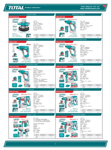 www.totalbusiness.comTOTAL TOOLS CO., PTE. LTD.www.totaltools.cn 01Unit Qty/Pack Qty/CtnPCS 1 426mm鋰電電鎚-雙4A組UTRHLI202682無刷馬達 電壓:20V 空載轉速:0-1100rpm 衝擊速率:0-5000bpm 衝擊能量:2.5J 最大鑽孔能力: 混凝土:26mm 鋼材:13mm 木材:30mm SDS 加卡盤系統整合式 LED 工作燈 包括: 3 件鑽頭(6、8、10mm) 1 件鑿子 Unit Qty/Pack Qty/CtnSET 1 1鋰電重工三件套UTOSLI250281電壓:20V 帶 1 個無線電錘 (TRHLI20288) 帶 1 個無線衝擊扳手 (TIWLI201351) 帶 1 個無刷無線衝擊鑽 (TIDLI209681) 無線電錘 (TRHLI20288): 無刷馬達 空載轉速 衝擊速率 衝擊能量:4.5J 最大鑽孔能力: 混凝土:28mm 鋼材:13mm 木材:40mm Unit Qty/Pack Qty/CtnPCS 1 4鋰電電錘-單主機TRHLI20268無刷馬達 電壓:20V 空載轉速:0-1100rpm 衝擊速率:0-5000bpm 衝擊能量:2.5J 最大鑽孔能力: 混凝土:26mm 鋼材:13mm 木材:30mm SDS 加卡盤系統整合式 LED 工作燈 包括: 3 個鑽頭(6、8、10 毫米) 1 個鑿子 Unit Qty/Pack Qty/CtnPCS 1 4鋰電電錘TRHLI21228無刷馬達 電壓:20V 空載轉速:0-1100rpm 衝擊速率:0-5400bpm 衝擊能量:2.0J 最大鑽孔能力: 混凝土:22mm 鋼材:13mm 木材:28mm SDS Plus 卡盤系統 整合式 LED 工作燈 包括: 3 個鑽頭(6、8、10 毫米) 1 個鑿子 Unit Qty/Pack Qty/CtnPCS 1 4鋰電電錘-雙4A組UTRHLI212282無刷馬達 電壓:20V 空載轉速:0-1100rpm 衝擊速率:0-5400bpm 衝擊能量:2.0J 最大鑽孔能力: 混凝土:22mm 鋼材:13mm 木材:28mm SDS Plus 卡盤系統 整合式 LED 工作燈 包括: 3 個鑽頭(6、8、10mm) 1 個鑿子 Unit Qty/Pack Qty/CtnPCS 1 4鋰電輕型電鎚-單2A組TRHLI201881無刷馬達 電壓:20V 空載轉速:0-850rpm 衝擊率:0-5100bpm 衝擊能量:1.8J 最大鑽孔能力:φ18(混凝土) SDS 加卡盤系統 整合式 LED 工作燈 包括: 3 個鑽頭 1 個 2.0Ah 電池(TFBLI20011) 1 個充電器(TFCLI2001) 充電電壓:220-240V~50/60Hz 手提箱包裝Unit Qty/Pack Qty/CtnPCS 1 4無刷2段鋰電電錘18mm/20VTRHLI20188無刷馬達 電壓:20V 空載轉速:0-850rpm 衝擊率:0-5100bpm 衝擊能量:1.8J 最大鑽孔能力:φ18(混凝土) SDS 加卡盤系統 整合式 LED 工作燈 包括:3 個鑽頭 充電器單獨出售 彩盒包裝Unit Qty/Pack Qty/CtnPCS 1 4鋰電輕型電鎚TRHLI1601電壓:20V 空載轉速:0-900rpm 衝擊頻率:0-5100bpm 衝擊能量:1.5J 最大鑽孔能力: 混凝土:16mm 鋼材:10mm 木材:20mm 整合式工作燈 SDS 加卡盤系統 3 個鑽頭 電池和充電器單獨出售 彩盒包裝Unit Qty/Pack Qty/CtnPCS 1 420V鋰電簡易四溝電鑽TRHLI20168電壓:20V 空載轉速:0-850rpm 衝擊率:0-5100bpm 衝擊能量:1.5J 最大鑽孔能力:混凝土中Φ16 SDS 加卡盤系統整合式 LED 工作燈 包括:3 個鑽頭 彩盒包裝Unit Qty/Pack Qty/CtnPCS 1 4鋰電10吋打蠟機TOPLI202548無刷馬達 電壓:20V 空載轉速:2500rpm 拋光盤直徑:254mm 偏心距:5mm 附 1 個羊毛拋光帽 附 1 個毛巾拋光帽 電池和充電器單獨出售 彩盒包裝5