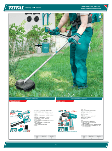 www.totalbusiness.comTOTAL TOOLS CO., PTE. LTD.www.totaltools.cn 01Unit Qty/Pack Qty/CtnSET 1 812v鋰電20N.m震動電鑽組TCKLI1226電壓:12V 1PCS 鋰電震動電鑽(TIDLI12206) 空載轉速:400/0-1500rpm 最大衝擊率:22500bpm 最大扭力:20Nm 塑膠卡盤 卡盤容量:0.8-10mm(1/32-3/8\18+ 扭力設定:18+11 整合 LED 工作燈 包括: 2 件 1.5Ah 電池組(TBLI12153) 1 套 16 件金屬、磚石和木材鑽頭套裝(TACSDL11608) 1 套 49 件衝擊螺絲起子頭套裝(TACSDL24906) 1 件電纜 AUC 型電纜包裝(TTITIC01 型)電纜(AUC 型電纜包裝線)Unit Qty/Pack Qty/CtnSET 1 216V花剪吹葉機雙機組UTOSLI250385電壓:16V 帶 1 個無線直剪(TSSLI16258) 附 1 個無線鼓風機(TABLI16808) 無線直剪(TSSLI16258):無刷馬達 切割直徑:25mm 無線鼓風機(TABLI16808):無刷馬達 切割直徑:25mm 無線鼓風機(TABLI16808):空載轉速:0-13000rpm 平均風量:5m3/min 最大風速:50m/s 包括:1 個油瓶磨空) 1 個油塊護石 1 1 5 件套 1 個油瓶(空)。 電池組(TFBLI1620) 1 個 M16 充電器(UTFCLI1613) 充電電壓:110-120V~50/60Hz 彩盒包裝63