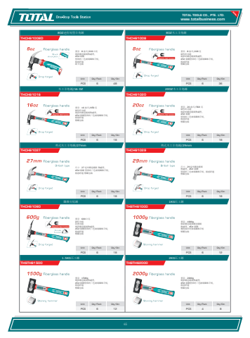 www.totalbusiness.comTOTAL TOOLS CO., PTE. LTD.www.totaltools.cn 01Unit Qty/Pack Qty/CtnPCS 4 82KG石工錘THSTH62000重量:2000g 創新鍛造鎚頭熱處理, 45# 碳鋼堅固的三色玻璃纖維手柄, 握感舒適 標籤包裝Unit Qty/Pack Qty/CtnPCS 6 121.5KG石工錘THSTH61500重量:1500g 創新鍛造鎚頭熱處理, 45# 碳鋼堅固的三色玻璃纖維手柄, 握感舒適 標籤包裝Unit Qty/Pack Qty/CtnPCS 6 121KG石工錘THSTH61000重量:1000g 創新鍛造鎚頭鍛造鎚頭 熱處理,45# 碳鋼 獨特設計的玻璃纖維手柄 標籤包裝Unit Qty/Pack Qty/CtnPCS 6 18纖維尖尾錘THCH61060重量:600 公克 磁釘功能 防滑功能 創新鍛造鎚頭熱處理, 45# 碳鋼堅固的三色玻璃纖維手柄, 握感舒適 標籤包裝Unit Qty/Pack Qty/CtnPCS 6 18英式木工羊角錘/29mmTHCH61029尺寸:29 毫米鍛造鎚頭 熱處理,45# 碳鋼 堅固的三色玻璃纖維手柄,握感舒適 標籤包裝Unit Qty/Pack Qty/CtnPCS 6 18英式木工羊角錘/27mmTHCH61027尺寸:27 毫米鍛造鎚頭 熱處理, 45# 碳鋼 堅固的三色玻璃纖維手柄, 握感舒適 標籤包裝Unit Qty/Pack Qty/CtnPCS 6 1820OZ木工羊角錘THCH61020重量:20 盎司 /560 克 磁性釘功能 創新的鍛造鎚頭熱處理, 45# 碳鋼 堅固的三色玻璃纖維手柄, 握感舒適 標籤包裝Unit Qty/Pack Qty/CtnPCS 6 18木工羊角錘/16 OZTHCH61016重量:16 盎司 /450 克 磁性釘功能 創新的鍛造鎚頭熱處理, 45# 碳鋼堅固的三色玻璃纖維手柄, 握感舒適 標籤包裝Unit Qty/Pack Qty/CtnPCS 6 368OZ木工羊角錘THCH61008重量:8 盎司 /220 克 磁性釘功能 創新的鍛造鎚頭熱處理, 45# 碳鋼堅固的三色玻璃纖維手柄, 握感舒適 標籤包裝Unit Qty/Pack Qty/CtnPCS 6 488OZ迷你短型羊角錘THCH61008D重量:8 盎司 /220 公克 創新鍛造鎚頭熱處理, 45# 碳鋼 堅固的三色玻璃纖維手柄, 握感舒適 紙卡包裝65