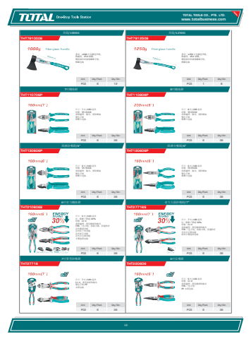 www.totalbusiness.comTOTAL TOOLS CO., PTE. LTD.www.totaltools.cn 01Unit Qty/Pack Qty/CtnPCS 6 366吋長嘴鉗THT220606尺寸:6 吋 /160 毫米 材質:Cr-V 表面處理:黑色飾面和拋光 TPR 三色手柄 PP 衣架包裝Unit Qty/Pack Qty/CtnPCS 6 367吋重型斜嘴鉗THT27716尺寸:7 吋 /180 毫米 Cr-V,黑色表面和拋光 雙色手柄 PP 衣架包裝Unit Qty/Pack Qty/CtnPCS 6 36省力大頭斜嘴鉗/7\THT27716S尺寸:7 吋 /180 毫米 比一般鉗子節能 30% 材質:Cr-V 表面處理:黑色飾面和拋光 TPR 三色手柄,抓握力強,舒適性好 具有去毛刺功能 採用半雙泡罩包裝Unit Qty/Pack Qty/CtnPCS 6 366吋省力鋼絲鉗THT210606S尺寸:6 吋 /160 毫米 比一般鉗子節能 30% 材質:Cr-V 表面處理:黑色飾面和拋光 TPR 三色手柄,抓握力強,舒適性好 具有壓接功能 具有釘子夾功能 具有扳手功能 具有去毛刺功能 半雙泡罩包裝Unit Qty/Pack Qty/CtnPCS 6 36經濟尖嘴鉗/6\THT120606P尺寸:6 吋 /160 毫米 材質:55 號碳鋼 表面處理:拋光、塗防銹油 雙色手柄 滑動卡包裝Unit Qty/Pack Qty/CtnPCS 6 36經濟斜嘴鉗/6\THT130606P尺寸:6 吋 /160 毫米 材質:55 號碳鋼 表面處理:拋光、塗防銹油 雙色手柄 滑動卡包裝Unit Qty/Pack Qty/CtnPCS 6 368吋鋼絲鉗THT110806P尺寸:8 吋 /200 毫米 材質:55 號碳鋼 表面處理:拋光、塗防銹油 雙色手柄 滑動卡包裝Unit Qty/Pack Qty/CtnPCS 6 367吋鋼絲鉗THT110706P尺寸:7 吋 /180 毫米 材質:55 號碳鋼 表面處理:拋光、塗防銹油 雙色手柄 滑動卡包裝Unit Qty/Pack Qty/CtnPCS 1 8斧頭/1250GTHT7812506重量:1250 公克鍛造斧頭, 熱處理,45# 碳鋼, 獨特設計的玻璃纖維手柄, 標籤包裝Unit Qty/Pack Qty/CtnPCS 6 12斧頭/1000GTHT7810006重量:1000 公克鍛造斧頭, 熱處理,45# 碳鋼, 獨特設計的玻璃纖維手柄, 標籤包裝68