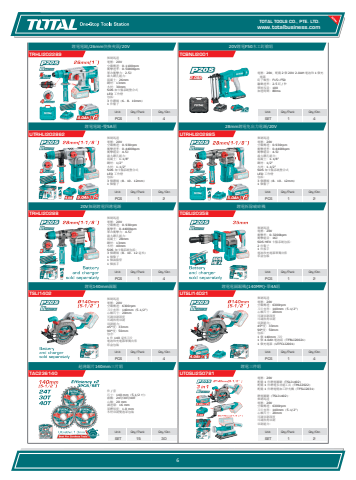 www.totalbusiness.comTOTAL TOOLS CO., PTE. LTD.www.totaltools.cn 01Unit Qty/Pack Qty/CtnSET 1 2鋰電三件組UTOSLI250781電壓:20V 配備 1 件鋰電圓鋸(TSLI1402) 配備 1 件鋰電多功能工具(TMLI2022) 配備 1 件鋰電精加工砂光機(TFSLI2031) 鋰電圓鋸(TSLI1402): 無刷馬達 電壓:20V 空載轉速:6300rpm 刀片直徑:140mm(5-1/2'') 心軸尺寸:20mm 可調切割深度 可調斜角切割 切割能力: Unit Qty/Pack Qty/CtnSET 15 30超薄鋸片140mm三片組TAC236140件 / 套 尺寸:140 mm(5-1/2 吋) 齒數:24T/30T/40T 心軸:20 mm 減速環:16 mm 基體厚度:1.0 mm 木材切割雙泡罩包裝Unit Qty/Pack Qty/CtnPCS 1 4鋰電電圓鋸機(140MM)-單4A組UTSLI14021無刷馬達 電壓:20V 空載轉速:6300rpm 刀片直徑:140mm(5-1/2'') 心軸尺寸:20mm 可調切割深度 可調斜角切割 切割能力: 45°度:33mm 90°度:50mm 包括: 1 個 140mm 刀片 1 個 4.0Ah 電池組(TFBLI20021) 1 個充電器(UTFCLI2001) Unit Qty/Pack Qty/CtnPCS 1 4鋰電140mm圓鋸TSLI1402無刷馬達 電壓:20V 空載轉速:6300rpm 刀片直徑:140mm(5-1/2'') 心軸尺寸:20mm 可調切割深度 可調斜角切割 切割能力: 45°度:33mm 90°度:50mm 包含: 1 件 140 毫米刀片 電池和充電器單獨出售 彩盒包裝Unit Qty/Pack Qty/CtnPCS 1 2鋰電拆除破碎機TDBLI20358無刷馬達 電壓:20V 衝擊率:0-3200bpm 衝擊能量:16J SDS HEX 卡盤系統包括: 2 件鑿子 1 件扳手 電池和充電器單獨出售 彩盒包裝Unit Qty/Pack Qty/CtnPCS 1 420V無刷鋰電四溝電錘TRHLI20288無刷馬達 電壓:20V 空載轉速:0-930rpm 衝擊率:0-4400bpm 單次衝擊力:4.5J 最大鑽孔能力: 混凝土:28mm 鋼材:13mm 木材:40mm SDS 加卡盤系統包括: 3 個鑽頭(8、10、12 毫米) 1 個鑿子 1 個油脂管 1 個扳手 Unit Qty/Pack Qty/CtnPCS 1 228mm鋰電免出力電錘/20VUTRHLI202885無刷馬達 電壓:20V 空載轉速:0-930rpm 衝擊速率:0-4400bpm 衝擊能量:4.5J 最大鑽孔能力: 混凝土:1-1/8\鋼材:1/2\木材:1-1/2\SDS 加卡盤系統整合式 LED 工作燈 包括: 3 個鑽頭(8、10、12mm) 1 個鑿子 Unit Qty/Pack Qty/CtnPCS 1 2鋰電電鎚-雙5A組UTRHLI202862無刷馬達 電壓:20V 空載轉速:0-930rpm 衝擊速率:0-4400bpm 衝擊能量:4.5J 最大鑽孔能力: 混凝土:1-1/8\鋼材:1/2\木材:1-1/2\SDS 加卡盤系統整合式 LED 工作燈 包括: 3 個鑽頭(8、10、12mm) 1 個鑿子 Unit Qty/Pack Qty/CtnSET 1 420V鋰電F50木工釘槍組TCBNLI2001電壓:20V,配備 2 個 20V 2.0AH 電池和 1 個充電器 釘子類型:F15~F50 驅動速率:2.5 釘 / 秒 彈匣容量:100 加速時間:80msUnit Qty/Pack Qty/CtnPCS 1 4鋰電電鎚/26mm快換夾頭/20VTRHLI202289無刷馬達 電壓:20V 空載轉速:0-1100rpm 衝擊速率:0-5000bpm 單次衝擊力:2.5J 最大鑽孔能力: 混凝土:26mm 鋼材:13mm 木材:30mm SDS 加卡盤系統整合式 LED 工作燈 包括: 3 件鑽頭(6、8、10mm) 1 件鑿子 6