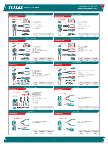 www.totalbusiness.comTOTAL TOOLS CO., PTE. LTD.www.totaltools.cn 01Unit Qty/Pack Qty/CtnPCS 12 120迷你扁嘴鉗THTMN856尺寸:4.5 吋 /115 毫米拋光防銹油雙色手柄滑動卡包裝Unit Qty/Pack Qty/CtnPCS 12 120迷你彎嘴鉗THTMN456尺寸:4.5 吋 /115 毫米拋光防銹油 雙色手柄滑動卡包裝Unit Qty/Pack Qty/CtnPCS 12 120迷你斜嘴鉗THTMN356尺寸:4.5 吋 /115 毫米拋光防銹油雙色手柄滑動卡包裝Unit Qty/Pack Qty/CtnSET 5 20超級省力鉗組套/3PCSTHT2CK231S尺寸:8 吋複合式鋼絲鉗 8 吋複合式斜嘴鉗 8.5 吋複合式尖嘴鉗 比普通鉗子節能 65% 材質:Cr-V 表面處理:特氟龍塗層 TPR 三色手柄,抓握力強,舒適性好 帶釘子夾功能 帶扳手功能 帶去毛刺功能 半雙泡罩包裝Unit Qty/Pack Qty/CtnPCS 6 36多功能尖嘴鉗/8\THTMF2866 合 1 多功能尖嘴鉗尺寸:8 吋 /200 毫米 材質:Cr-V 表面處理:黑色表面和拋光 多用途設計讓您使用一個工具完成更多任務 TPR 三色手柄,抓握力強,舒適度高 採用半雙泡罩包裝Unit Qty/Pack Qty/CtnPCS 6 36多功能鋼絲鉗/8\THTMF1868 合 1 多功能組合鉗 尺寸:8 吋 /200 毫米 材質:Cr-V 表面處理:鐵氟龍塗層 多用途設計,讓您用一個工具完成更多任務 TPR 三色手柄,抓握力強,舒適度高 採用半雙泡罩包裝Unit Qty/Pack Qty/CtnPCS 6 36超級省力頂切鉗/8.5\THTC560806尺寸:8.5 吋 /215 毫米 比一般鉗子節能 65% 材質:Cr-V 表面處理:鐵氟龍塗層 TPR 三色手柄,抓握力強,舒適度高 採用半雙泡罩包裝Unit Qty/Pack Qty/CtnPCS 6 36超級省力尖嘴鉗/8.5\THTC520806尺寸:8.5 吋 /215 毫米 比一般鉗子節能 65% 材質:Cr-V 表面處理:特氟龍塗層 TPR 三色手柄,抓握力強,舒適性好 帶扳手功能 採用半雙泡罩包裝Unit Qty/Pack Qty/CtnPCS 6 36超級省力斜嘴鉗/9\THTC530906尺寸:9 吋 /228 毫米 比一般鉗子節能 65% 材質:Cr-V 表面處理:特氟龍塗層 TPR 三色手柄,握感強,舒適 具有去毛刺功能 採用半雙泡罩包裝Unit Qty/Pack Qty/CtnPCS 6 36超級省力斜嘴鉗/8\THTC530806尺寸:8 吋 /200 毫米 比一般鉗子節能 65% 材質:Cr-V 表面處理:特氟龍塗層 TPR 三色手柄,握感強,舒適 具有去毛刺功能 採用半雙泡罩包裝70