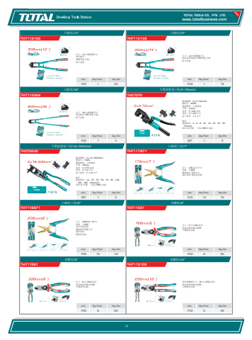 www.totalbusiness.comTOTAL TOOLS CO., PTE. LTD.www.totaltools.cn 01Unit Qty/Pack Qty/CtnPCS 6 36電纜剪/10\THT115102重型電纜剪尺寸:10 吋 /250 毫米 黑色表面和拋光碳鋼 半雙泡罩包裝Unit Qty/Pack Qty/CtnPCS 6 60電纜剪/8\THT11581尺寸:8 吋 /200 毫米 黑色表面和拋光碳鋼 半雙泡罩包裝Unit Qty/Pack Qty/CtnPCS 6 90電纜剪/6\THT11561尺寸:6 吋 /160 毫米 黑色表面和拋光碳鋼 半雙泡罩包裝Unit Qty/Pack Qty/CtnPCS 12 72白鐵電工剪/8\THT118871尺寸:200mm(8 吋) 材質:不鏽鋼 具有切割功能 獨特設計帶齒刀片 噴砂表面 雙泡罩包裝Unit Qty/Pack Qty/CtnPCS 12 72白鐵電工剪/7\THT117871尺寸:178 毫米 7 吋 材質:不鏽鋼 獨特設計 帶齒刀片 噴砂表面 雙泡罩包裝Unit Qty/Pack Qty/CtnSET 1 2手動液壓端子鉗/16-240mm2THCT0240壓接範圍:Cu 16-300mm2 壓接力:70kN 壓接類型:六角壓接 行程:18mm 長度:約 475 毫米 重量:約 3.6 公斤 盒子重量:約 1.8 公斤 配件 壓接模具:16、25、35、50、70、95、120、150、185、240mm2 密封 O 型環:一組由 BMC 包裝Unit Qty/Pack Qty/CtnSET 1 5手動液壓端子鉗/4-70mm2THCT070壓接範圍:Cu 4-70mm2 壓接力:45KN 壓接類型:六角壓接 行程:11mm 長度:約 310 毫米 重量:約 1.80 公斤 盒子重量:1.1 公斤 配件 壓接模具:4、6、8、10、16、25、35、50、70mm2 密封 O 型環:一組由 BMC 包裝Unit Qty/Pack Qty/CtnPCS 1 3大鐵剪/36\THT113366尺寸:36 吋鉻鉬鋼刀片 黑色拋光 TPR 雙色手柄, 紙卡包裝Unit Qty/Pack Qty/CtnPCS 1 16大鐵剪/14\THT113146尺寸:14 吋鉻鉬鋼刀片 黑色表面和拋光 TPR 雙色手柄 紙卡包裝Unit Qty/Pack Qty/CtnPCS 1 20大鐵剪/12\THT113126尺寸:12 吋鉻鉬鋼刀片 黑色拋光 TPR 雙色手柄, 紙卡包裝78