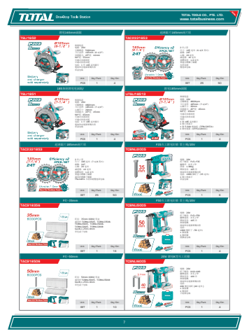 www.totalbusiness.comTOTAL TOOLS CO., PTE. LTD.www.totaltools.cn 01Unit Qty/Pack Qty/CtnPCS 1 420V 鋰電K型木工釘槍TCSNLI6005電壓:20V 釘子類型:K10~K40 驅動速度:3 釘 / 秒 彈匣容量:100 件 無刷電機 電池和充電器單獨出售 包括: 400 個皇冠釘 (40 毫米 ) 1 個氣嘴 1 個別針 手提箱包裝Unit Qty/Pack Qty/CtnSET 1 10F釘-50mmTAC918506釘長:50mm 6000/ 彩盒 適用於 TCBNLI5005、TCBNLI5008 Ga18,1.25X1.0mm 彩色盒子包裝Unit Qty/Pack Qty/CtnPCS 1 4F50木工鋰電釘槍 單主機/20VTCBNLI5005電壓:20V 釘子類型:F15~F50 驅動速度:3 釘 / 秒 彈匣容量:105 件 無刷電機 電池和充電器單獨出售 包括: 1000 個釘子(50 毫米) 1 個氣嘴 1 個針腳 塑膠盒包裝Unit Qty/Pack Qty/CtnSET 1 16F釘-35mmTAC918356釘長:35mm 6000/ 彩盒 適用於 TCBNLI3505、TCBNLI3508、 TCBNLI5005、TCBNLI5008、 TCBNLI2005、TCBNLI2008 Ga18,1.25X1.0mm 彩色盒子包裝Unit Qty/Pack Qty/CtnPCS 1 6F35木工鋰電釘槍 單主機/20VTCBNLI2005電壓:20V 釘子類型:F15~F35 驅動率:2 釘 / 秒 淨重:1.98kg 彈匣容量:105 件 電池和充電器單獨出售 包括:1000 個釘子(35 毫米) 1 個六角扳手 彩盒包裝Unit Qty/Pack Qty/CtnSET 25 50超薄鋸片185mm兩片組TAC23318532 件 / 套 尺寸:185 毫米(7-1/4 英吋) 齒數:24T 心軸:20 毫米 減速環:16 毫米 基體厚度:1.0 毫米 更適合鋰離子圓鋸 適用於鋰離子圓鋸 TSLI1851 木材切割雙泡罩包裝Unit Qty/Pack Qty/CtnPCS 1 4鋰電185mm圓鋸UTSLI18513無刷馬達 電壓:20V 空載轉速:4800rpm 刀片直徑:185mm(7-1/4'') 心軸尺寸:20mm 切割能力:45°度:45mm 90°度:65mm 可調式切割深度 可調式斜角切割 包括: 1 個 185 毫米鋸片 1 個六角扳手 1 個 5.0Ah 電池組(TFBLI20531) 1 個充電器(UTFCLI20411) Unit Qty/Pack Qty/CtnPCS 1 4185無刷鋰電電圓鋸/TSLI1851無刷馬達 電壓:20V 空載轉速:4800rpm 刀片直徑:185mm(7-1/4'') 心軸尺寸:20mm 切割能力:45°度:45mm 90°度:65mm 可調式切割深度 可調式斜角切割 包括:1 件 185 毫米鋸片 電池和充電器單獨出售 彩盒包裝Unit Qty/Pack Qty/CtnSET 25 50超薄鋸片165mm兩片組TAC23316532 件 / 套 尺寸:165 毫米(6-1/2 英吋) 齒數:24T 心軸:20 毫米 減速環:16 毫米 基體厚度:1.0 毫米 更適合鋰離子圓鋸 木材切割 雙泡罩包裝Unit Qty/Pack Qty/CtnPCS 1 4鋰電165mm圓鋸TSLI1652無刷馬達 電壓:20V 空載轉速:5200rpm 刀片直徑:165mm(6-1/2'') 切割能力:45°度:42mm 90°度:55mm 可調式切割深度 可調式斜角切割 包括:1 件 165 毫米鋸片 電池和充電器單獨出售 彩盒包裝7