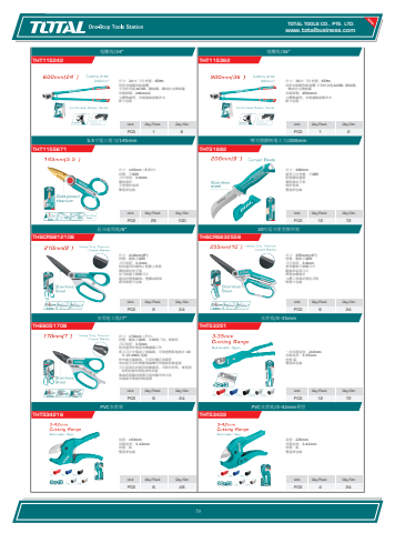 www.totalbusiness.comTOTAL TOOLS CO., PTE. LTD.www.totaltools.cn 01Unit Qty/Pack Qty/CtnPCS 4 24PVC水管剪/3-42mm重型THT53422長度:225mm 切割直徑:3-42mm 材質:鋁 雙泡罩包裝Unit Qty/Pack Qty/CtnPCS 6 48PVC水管剪THT534216長度:193mm 切割直徑:3-42mm 材質:鋁 雙泡罩包裝Unit Qty/Pack Qty/CtnPCS 12 72水管剪/3-35mmTHT53351一次切割長度:210mm 切割直徑:3-35mm 材質 鋁 雙泡罩包裝Unit Qty/Pack Qty/CtnPCS 6 24多用電工剪/7\THES051708尺寸:170mm(7 吋) 材質:鍍鈦不鏽鋼,比鋼硬三倍,更耐用 刀片厚度:3.5mm 特別適用於電氣和數據線工作 剪刀刀片中集成了剝線鉗,可快速輕鬆地剝去 19 和 23 AWG 電線 的外緣呈鋸齒狀,可用於擴孔和導管 夾持區可用於擰緊電線螺母和壓接低壓連接 刀片底部具有耐用的鋸齒狀,可抓住材料,實現更好的控制和更乾淨的切割 集成的電線切割器可提供額外的力量 切割器可吸塑和吸塑器Unit Qty/Pack Qty/CtnPCS 6 2410吋長刃重型實用剪THSCRS832558尺寸:255mm(10\材質:鍍鈦不鏽鋼 刀片厚度:3.6mm 重型鍍鈦不銹鋼刀片 鋸齒狀底部刀片 彈簧加載設計 人體工學設計優化手柄 吸塑卡包裝Unit Qty/Pack Qty/CtnPCS 6 24長刃通用剪/8\THSCRS812108尺寸:210mm(8\材質:鍍鈦不鏽鋼 刀片厚度:3.2mm 特別適用於織物 / 塑膠 / 紙板 獨特設計的手柄 長刃鈦鍍不銹鋼刀片 適用於輕質織物、塑膠或紙板 採用吸塑卡包裝Unit Qty/Pack Qty/CtnPCS 12 72彎刃塑膠柄電工刀/200mmTHT51882尺寸:200mm 弧形刀片材質:不鏽鋼 附塑膠保護蓋 獨特設計手把 噴砂表面 雙泡罩包裝Unit Qty/Pack Qty/CtnPCS 25 1005.5寸電工剪刀/145mmTHT1155871尺寸:145mm(5.5 吋) 材質:不鏽鋼 刀片厚度:3.0mm 獨特設計 手把噴砂表面 雙泡罩包裝Unit Qty/Pack Qty/CtnPCS 1 2電纜剪/36\THT115362尺寸:36 吋 刀片材質:65Mn 用於切割銅和鋁電纜 不用於切割 ACSR、鋼絲繩、鋼或自支撐絞線 切割面積:450mm2 主體熱處理,切割邊緣感應淬火 紙卡包裝Unit Qty/Pack Qty/CtnPCS 1 6電纜剪/24\THT115242尺寸:24 吋 刀片材質:65Mn 用於切割銅和鋁電纜 不用於切割 ACSR、鋼絲繩、鋼或自支撐絞線 切割面積:240mm2 主體熱處理,切割邊緣感應淬火 紙卡包裝79