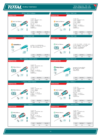 www.totalbusiness.comTOTAL TOOLS CO., PTE. LTD.www.totaltools.cn 01Unit Qty/Pack Qty/CtnPCS 12 144十字螺絲起子/PH3*150mmTSDPH3150刀片材質:S2 刀頭類型:十字槽 PH3(磁性) 刀片長度:150mm 刀片直徑:8.0mm 刀柄類型:圓形 手柄材質:三色人體工學 1 件螺絲刀,帶 1 個塑膠衣架 具有強磁性 由塑膠衣架包裝Unit Qty/Pack Qty/CtnPCS 12 144迷你十字螺絲起子TSDPH2038刀片材質:S2 刀頭類型:菲力浦斯 PH2(磁性) 刀片長度:38 毫米 刀片直徑:6.0 毫米 柄型:圓形 手柄材質:三色人體工學 1 件螺絲刀,帶 1 個塑膠掛鉤 具有強磁性 由塑膠掛鉤包裝Unit Qty/Pack Qty/CtnPCS 12 144迷你一字螺絲起子TSDSL6038刀片材質:S2 刀尖類型:開槽 SL6.5(磁性) 刀尖尺寸:6.5mm 刀片長度:38mm 刀片直徑:6.0mm 柄型:圓形 手柄材質:三色人體工學 1 件螺絲刀,帶 1 個塑膠掛鉤 具有強磁性 由塑膠掛鉤包裝Unit Qty/Pack Qty/CtnPCS 12 144十字螺絲起子/PH2*150mmTSDPH2150刀片材質:S2 刀頭類型:十字槽 PH2(磁性) 刀片長度:150mm 刀片直徑:6.0mm 柄型:圓形 手柄材質:三色人體工學 1 件螺絲刀,帶 1 個塑膠掛鉤 具有強磁性 由塑膠掛鉤包裝Unit Qty/Pack Qty/CtnPCS 12 144螺絲起子PH2*125THT26PH21251pcs 螺絲起子配 1pcs 塑膠掛鉤 S2, PH2, 圓柄直徑:6.0mm 長度:125mm 用塑膠衣架包裝Unit Qty/Pack Qty/CtnPCS 12 144帶磁十字螺絲起子/PH2*125mmTSDPH2125刀片材質:S2 刀頭類型:菲力浦斯 PH2(磁性) 刀片長度:125 毫米 刀片直徑:6.0 毫米 柄型:圓形 手柄材質:三色人體工學 1 件螺絲刀,帶 1 個塑膠掛鉤 具有強磁性 由塑膠掛鉤包裝Unit Qty/Pack Qty/CtnPCS 12 144螺絲起子 PH1*100TSDPH1100刀片材質:S2 刀頭類型:十字槽 PH1(磁性) 刀片長度:100mm 刀片直徑:5.0mm 柄型:圓形 手柄材質:三色人體工學 1 件螺絲刀,帶 1 個塑膠掛鉤 具有強磁性 由塑膠掛鉤包裝Unit Qty/Pack Qty/CtnPCS 12 144螺絲起子SL8.0*200THT2682001 件螺絲刀,附 1 個塑膠掛鉤 S2, 圓柄,開槽:8.0 毫米,直徑:8.0 毫米, 長度:200 毫米用塑膠衣架包裝Unit Qty/Pack Qty/CtnPCS 12 144螺絲起子 PH2*150TSDSL6150刀片材質:S2 刀尖類型:開槽 SL6.5(磁性) 刀尖尺寸:6.5mm 刀片長度:150mm 刀片直徑:6.0mm 柄型:圓形 手柄材質:三色人體工學 1 件螺絲刀,帶 1 個塑膠掛鉤 具有強磁性 由塑膠掛鉤包裝Unit Qty/Pack Qty/CtnPCS 12 144螺絲起子 SL5.5*100mmTSDSL5100刀片材質:S2 刀尖類型:開槽 SL5.5(磁性) 刀尖尺寸:5.5mm 刀片長度:100mm 刀片直徑:5.0mm 柄型:圓形 手柄材質:三色人體工學 1 件螺絲刀,帶 1 個塑膠掛鉤 具有強磁性 由塑膠掛鉤包裝80