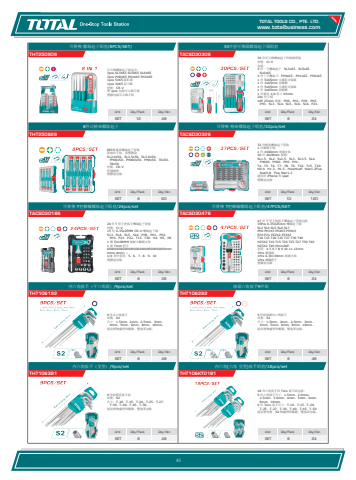 www.totalbusiness.comTOTAL TOOLS CO., PTE. LTD.www.totaltools.cn 01Unit Qty/Pack Qty/CtnSET 6 24內六角(六角 星型)扳手組套/18pcs/setTHT106KT018118 件六角扳手和 Torx 扳手組包括:9 件六角扳手尺寸:1.5mm、2.0mm、2.5mm、3.0mm、4mm、5mm、6mm、8mm、10mm。9 件 Torx 扳手尺寸:T-10、T-15、T-20、T-25、T-27、T-30、T-40、T-45、T-50超長臂材質:S2 熱處理和鍍鉻,雙泡罩包裝。Unit Qty/Pack Qty/CtnSET 6 48內六角扳手(星型)/9pcs/setTHT1063919 件組梅花扳手組 材質:S2 尺寸:T-10、T-15、T-20、T-25、T-27、T-30、T-40、T-45、T-50。 超長臂熱處理和鍍鉻,雙泡罩包裝Unit Qty/Pack Qty/CtnSET 6 48球頭六角扳手9件組THT1062929 件組球頭內六角扳手 材質:S2 尺寸:1.5mm、2mm、2.5mm、3mm、4mm、5mm、6mm、8mm、10mm。 超長臂熱處理和鍍鉻,雙泡罩包裝。Unit Qty/Pack Qty/CtnSET 6 48內六角扳手(平六角頭)/9pcs/setTHT1061929 件式六角扳手 材質:S2 尺寸:1.5mm、2mm、2.5mm、3mm、4mm、5mm、6mm、8mm、10mm。 超長臂熱處理和鍍鉻,雙泡罩包裝。Unit Qty/Pack Qty/CtnSET 6 24可替換 T把棘輪螺絲起子組套/47PCS/SETTACSD3047647 件 T 型手柄扳手螺絲起子套裝包括 35Pcs 6.35X25mm 螺絲起子頭: SL3 SL4 SL5 SL6 SL7 PH0 PH1X3 PH2X5 PH3X3 PZ0 PZ1 PZ2X2 PZ3X2 T10 T15 T20 T25 T27 T30 T40 HZ3X2 T10 T15 T20 T25 T27 T30 T40 HZ3X2 T40 Hmm20P. 套筒:4 5 6 7 8 9 10 11 12mm 1Pcs 轉接器 1Pcs 6.3X139mm 批頭支架 1Pcs 棘輪把手 塑膠盒包裝Unit Qty/Pack Qty/CtnSET 6 36可替換 T把棘輪螺絲起子組套/24pcs/setTACSD3018624 件 T 型手把扳手螺絲起子套裝 材質:Cr-V 15 件 6.35x25MM CR-V 螺絲起子頭: SL3、SL4、SL5、SL6、PH0、PH1、PH2、PH3、PZ1、PZ2、T15、T20、H4、H5、H6 1 個 5X100MM 強磁力棘頭支架 1 批 Tmm 把手 6000000000000000000000000000000mm 4mm 4mm)( 1/4 英吋套筒:5、6、7、8、9、10 塑膠盒包裝Unit Qty/Pack Qty/CtnSET 10 120可替換 精密螺絲起子組套/32pcs/setTACSD3032632 件精密螺絲起子套裝 1 件風格手柄 1 件 4X60mm 批頭支架 30 件 4X28mm 批頭: SL1.5、SL2、SL2.5、SL3、SL3.5、SL4、PH000、PH00、PH0、PH1、 T4、T5、T6、T7、T8、T9、T10、T15、T20、 H0.9、H1.3、H1.5、HiveHiveF. Star1.2Five Star0.8、Five Star1.2 適用於 iPhone 和 ipad 塑膠盒包裝Unit Qty/Pack Qty/CtnSET 6 608件式精密螺絲起子THT2508268PCS 精密螺絲起子套裝 新設計手柄,新塑膠盒 SL2.0x50、SL2.5x50、SL3.0x50、PH00x50、PH000x50、PH0x50、T6x50、T8x50 材質:CR-V 舒適握柄 塑膠盒包裝Unit Qty/Pack Qty/CtnSET 6 2430件套可換頭螺絲起子頭組套TACSD30306 30 件可互換螺絲起子和批頭套裝 材質:Cr-V 包括: 3 件一字螺絲起子:SL3x65、SL5x65、SL6x65 3 件十字螺絲刀:PH0x65、PH1x65、PH2x65 1 件 5x65mm 大頭釘去除器 1 件 3x65mm 刮擦錐 1 件 5x65mm 大頭釘去除器 1 件 3x65mm 刮擦錐 1 件設計 1/4 英寸 65mm 201 件手柄 105 25mm 批頭:PH0、PH1、PH2、PH2、PH3、SL3、SL4、SL5、SL6、SL6、PZ1、Unit Qty/Pack Qty/CtnSET 12 48可替換 螺絲起子組套/8PCS/SET/THT250906可互換螺絲起子組包含: 3pcs SL3X65 SL5X65 SL6X65 3pcs PH0X65 PH1X65 PH2X65 1pcs 5X65 除釘器 1pcs 3X65 刮刀錐 材質:CR-V 帶 1pcs 包裝可互換手柄 塑膠包裝可互換手柄85