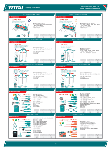 www.totalbusiness.comTOTAL TOOLS CO., PTE. LTD.www.totaltools.cn 01Unit Qty/Pack Qty/CtnSET 6 246件絕緣手工具組套THKIST30626 件組絕緣手工具包含: 1 件 SL5.5x125mm 絕緣螺絲起子 1 零件 SL4.0x100mm 絕緣螺絲起子 1 件 PH2x100mm 絕緣螺絲起子 1 件 7 吋絕緣鋼絲鉗 1 件 6 吋絕緣斜嘴鉗 1 支測試電筆(測試電壓:100-500VAC) 雙泡罩包裝Unit Qty/Pack Qty/CtnSET 1 1013 Pcs 電烙鐵工具組包TKTTSK0132 13 件式電信工具組 220-240V~50/60Hz 包含: 1 件 4.5 英寸尖嘴鉗 1 件 4.5 英寸斜嘴鉗 1 件一字螺絲刀 SL5.5x100mm 1 件十字螺絲刀 PH1x100mm 1 件精密螺絲刀 PH000x50mm 1 件精密螺絲刀 SL2.0x50mm 1 件 5.5 英寸電工剪刀 1 件 40w 電烙鐵 1 件電烙鐵支架 1 件 6 吋焊錫絲 1 件真空吸錫幫浦 1 件鑷子 125mm 1 件測電筆 140mm Unit Qty/Pack Qty/CtnSET 10 2011 Pcs 工具組包TKETS011111 件電工工具套裝包括: 1 把 4.5 英吋尖嘴鉗 1 把 4.5 英吋斜嘴鉗 1 把 7.5 英吋剝線鉗 1 把一字螺絲起子 SL5.5x 100mm 1 把十字螺絲起子 PH1x 100mm 1 把一字螺絲起子 SL5.5x 100mm 1 把十字螺絲起子 PH1x 100mm 1 把一字螺絲起子可折斷刀片小刀 1 把鎧 140mm VC0 140mm 測試電 140mm 5 顆絕緣 140mm 測試。 5.5 吋電工剪刀 1 個工具包 帆布袋包裝Unit Qty/Pack Qty/CtnSET 1 10家用工具9件組THKTHP900979 件手動工具組包括: 1 件 3mx16mm 鋼捲尺 1 件 PH1x100mm 十字螺絲起子 1 件 SL5.5x100mm 一字螺絲起子 1 件 8 吋活動扳手 1 件 6 吋尖嘴鉗 1 件 7 吋鋼絲鉗 1 件 可斷刀刀片美角刀 1 件 1 件羊角紙 1 件式 1 件套頭角刀 1 件套 90mmUnit Qty/Pack Qty/CtnSET 2 10經濟款T型柄星型內六角八件套/8pcs/setTHHW80836件 T 型手把梅花扳手組尺寸: T10X100、T15X100、T20X100、T25X150、 T30X150、T40X150、T45X200、T50X200 材質:S2,熱處理與鍍鉻 雙泡罩包裝 品牌專櫃雙泡罩包裝Unit Qty/Pack Qty/CtnSET 2 10經濟款T型柄球頭內六角八件套/8pcs/setTHHW808268 件 T 型手把球頭內六角扳手組 尺寸:2X100、2.5X100、3X100、4X150、5X150、6X150、8X200、10X200 材質:S2,熱處理和鍍鉻 品牌專屬貨架 雙泡罩包裝Unit Qty/Pack Qty/CtnSET 10 208件組T型柄六角扳手THHW80818 件 T 型手把六角扳手組 獨特設計新手把尺寸: 2X75、2.5X75、3X100、4X100、5X150、6X150、8X200、10X200 材質:Cr-V,熱處理鍍鉻,雙泡罩包裝Unit Qty/Pack Qty/CtnSET 2 10經濟款T型柄內六角八件套/8pcs/setTHHW808168 件 T 型柄內六角扳手組 尺寸:2X100、2.5X100、3X100、4X150、5X150、6X150、8X200、10X200 材質:S2,熱處理和鍍鉻 品牌專屬貨架 雙泡罩包裝Unit Qty/Pack Qty/CtnSET 12 96圓頭內六角摺疊扳手/8pcs/setTHT10618368 件組球頭內六角扳手組(袖珍型) 尺寸:2mm、2.5mm、3mm、4mm、5mm、6mm、7mm、8mm。 材質:CR-V 熱處理和鍍鉻 用塑膠衣架包裝。Unit Qty/Pack Qty/CtnSET 12 96內六角摺疊扳手/ 8PCS/SETTHT10618268 件組內六角扳手(袖珍型) 尺寸:2mm, 2.5mm, 3mm, 4mm, 5mm, 6mm, 7mm, 8mm。 材質:Cr-V 熱處理和鍍鉻 用塑膠衣架包裝。86