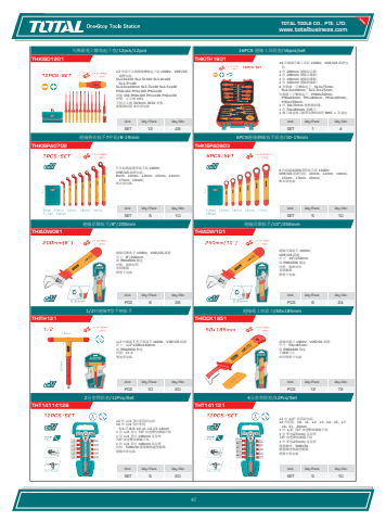 www.totalbusiness.comTOTAL TOOLS CO., PTE. LTD.www.totaltools.cn 01Unit Qty/Pack Qty/CtnSET 5 104分套筒組套/12Pcs/SetTHT14112112 件 1/2\10 件套筒:10、11、12、13、14、15、17、19、21、24mm1 件 1/2\1 件 5\72T 快速釋放棘輪手柄1 件 5\優質鋼材:50BV30優質鋼材熱處理鍍鉻塑膠衣架包裝Unit Qty/Pack Qty/CtnSET 5 202分套筒組套/12Pcs/SetTHT1411412612 件 1/4 英吋套筒組包括: 10 件 1/4 英吋套筒:5-6-7-8-9-10-11-12-13-14mm 1 件 1/4 英吋 72T 快速釋放棘輪手柄1 件 1/4 英吋 100mm 延長桿72T 快速釋放棘輪手柄1 件 1/4 英吋 100mm 延長桿材料:50BV30 優質鋼熱處理鍍鉻塑膠衣架包裝Unit Qty/Pack Qty/CtnPCS 12 72絕緣電工拆除刀/50x185mmTHIDCK1851絕緣拆解刀 1000V,VDE/GS 認證 尺寸:50x185mm 依 EN60900 製造 不鏽鋼刀片 採用吸塑卡包裝Unit Qty/Pack Qty/CtnPCS 10 201/2吋絕緣T型手柄扳手THITH1211/2 吋絕緣 T 型手柄扳手 1000V,VDE/GS 認證 尺寸:1/2\依 EN60900 製造 材質:Cr-V 雙泡罩包裝Unit Qty/Pack Qty/CtnPCS 6 24絕緣活動扳手/10“/250mmTHIADW101絕緣可調扳手 1000V, VDE/GS 認證 尺寸:10“/250mm 依 EN60900 製造 材質:鉻釩材料 表面鍍鉻 吸塑卡包裝Unit Qty/Pack Qty/CtnPCS 6 36絕緣活動扳手/8“/200mmTHIADW081絕緣活動扳手 1000V,VDE/GS 認證 尺寸:8“/200mm 依 EN60900 製造 材質:鉻釩材料 表面鍍鉻 吸塑卡包裝Unit Qty/Pack Qty/CtnSET 5 106PCS絕緣棘輪扳手組套/10-19mmTHKISPA06036 件組絕緣棘輪套筒扳手組 1000V, VDE/GS 認證包括:10mm、12mm、14mm、15mm、17mm、19mm; 帆布袋包裝Unit Qty/Pack Qty/CtnSET 5 10絕緣梅花扳手7件組/8-19mmTHKISPA07027 件組絕緣環形扳手組 1000V, VDE/GS 認證包括: 8mm、10mm、12mm、13mm、14mm、17mm、19mm; 帆布袋包裝Unit Qty/Pack Qty/CtnSET 1 416PCS 絕緣工具組套/16pcs/setTHKITH1601 16 件絕緣手動工具組 1000V,VDE/GS 認證包括: 1 件 200mm 絕緣組合鉗; 1 件 200mm 絕緣尖嘴鉗; 1 件 160mm 絕緣斜嘴鉗; 1 件 160mm 絕緣剝線鉗; 4 件絕緣一字螺絲起子:SL3x75mm;SL4.0x100mm;SL5.5x125mm; 件絕緣十字螺絲起子:PH00x50mm;PH0x60mm;PH1x80mm;PH2x100mm;PH3x150mm; 1 件 30x70mm 電壓測試儀; 1 件 50x180mm 電纜刀; 1 條乙烯基電工膠帶由獨特設計 BMC + 彩盒包Unit Qty/Pack Qty/CtnSET 12 48可換頭電工螺絲起子套/12pcs/12pcsTHKISD120112 件組可互換絕緣螺絲起子組 1000V,VDE/GS認證包括: SL2.0x100 SL2.5x100 SL3.0x100 SL3.5*100 SL4.0x100mm SL5.5x100 SL6.5x100 PH0x100 PH1x100 PH2x100 材質 100 PH0x100 PH1x100 PH2x100 材質:可互換 103 手柄可互換 303mm 3030 材質。 電壓測試器 帆布袋包裝87