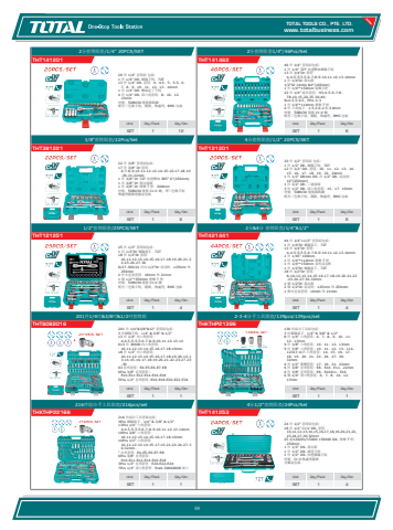 www.totalbusiness.comTOTAL TOOLS CO., PTE. LTD.www.totaltools.cn 01Unit Qty/Pack Qty/CtnSET 1 44分1/2\THT14125324 件 1/2\18 件 1/2\10,11,12,13,14,15,16,17,18,19,20,21,22,23,24,27,30,32mm 25 1/120201/15000 150000 DR. 滑動 T 桿:250mm 1 件 1/2\1 件 1/2\1 件 1/2\材質:Cr-V 熱處理鍍鉻 金屬盒包裝Unit Qty/Pack Qty/CtnSET 1 1216件綜合手工具組套/216pcs/setTHKTHP22166 216 件組合工具套裝包括: 3Pcs 棘輪板手:1/4\13Pcs 1/4\4-4.5-5-5.5-6-7-8-9-10-11-12-13-14mm 10Pcs 3/8\10-11-12-13-14-15-16-17-18-19mm 14Pcs 1/2\10-11-12-13-14-15-17-19-21-22-24-27-30-32mm \6Pcs 3/8\E10-E11-E12-E14-E16-E18 3Pcs 1/2\7Pcs 1/4\Unit Qty/Pack Qty/CtnSET 1 12-3-4分手工具組套/139pcs/139pcs/setTHKTHP21396 139 件組合工具組包括: 3 件棘輪扳手:1/4\8 件 1/4\12、13mm 9 件 3/8\9 件 3/8\12313 117. 六角套套:14、15、16、17、18、19、20、21、22、24、27、30、32mm 4 件 1/2\6 件 3/8\6 件 3/8\6 個 1/4\13mm Unit Qty/Pack Qty/CtnSET 1 1201件1/4吋&3/8吋&1/2吋套筒組THTS082016 201 件 1/4\3 件棘輪手柄:1/4\13 件 1/4\4-4.5-5-5.5-6-7-8-9-10-11-12-13-14 013 件 30000 內六角套筒:10-11-12-13-14-15-16-17-18-19mm 18 件 1/2\10-11-12-13-14-15-16-17-18-19-20-12-13-14-15-16-17-18-19-20-21-22-23-27-23-3003 星形套筒:E4-E5-E6-E7-E8 6Pcs 3/8\E10-E11-E12-E14-E16-E18 5Pcs 1/2\Unit Qty/Pack Qty/CtnSET 1 42分&4分 套筒組套/1/4\44PCS/SET THT421441 44 件 1/4\1 件 1/4\13 件 1/4\4-4.5-5-5.5-6-7-8-9-10-11-12-13-14mm 1 件 1/45\1 件 1/4\1 件 1/4\1 件 1/2\18 件 1/2\8-10-12-13-14-15-16-17-18-19-20-21-22-23-24-27-30-32mm 1 個 1/2\2 個 1/2\1 個火星塞套筒:16mm 和 21mm Unit Qty/Pack Qty/CtnSET 1 41/2\THT12125125 件 1/2\1 件 1/2\18 件 1/2\10-11-12-13-14-15-16-17-18-19-20-21-22-23-24-27-30 0/27-300/21 件向 1/2\250mm 2 件火星塞套筒:16mm 和 21mm 1 個 1/2\材質:50BV30 優質 Cr-V 鋼配有三色軟手柄,鍍鉻,熱處理,BMC 包裝Unit Qty/Pack Qty/CtnSET 1 64分套筒組套/1/2\THT12120120 件 1/2\1 件 1/2\12 件 1/2\15、16、17、18、19、22、24mm 1 件 1/2\10\1 件 1/2\3 件 1/2\材質:50BV30 優質鉻釩鋼 配有三色軟手柄,鍍鉻,熱處理,BMC 包裝Unit Qty/Pack Qty/CtnSET 1 63/8\THT38122122 件 3/8\17 件 3/8\6-7-8-9-10-11-12-13-14-15-16-17-18-19-20-21-22mm 1 件 3/8\1 件 3/8\1 件 3/8\材質:50BV30 優質 Cr-V 鋼,帶三色軟手柄熱處理鍍鉻塑膠盒包裝Unit Qty/Pack Qty/CtnSET 1 62分套筒組套1/4\THT14146246 件 1/4\1 件 1/4\13 件 1/4\4-4.5-5-5.5-6-7-8-9-10-11-12-13-14mm 1 件 1/4\1/2\1 件 1/4\22 件 1/4\T8-10-15-20-25-30-40;SL4-5.5-6.5;PH1-2-3 1 件 1/4\4 件 六角扳手:1.5-2.0-2.5-3.0mm 材質:50BV30 優質 Cr-V 鋼配有三色軟手柄,鍍鉻,熱處理,BMC 包裝Unit Qty/Pack Qty/CtnSET 1 122分套筒組套/1/4\THT14120120 件 1/4\1 件 1/4\13 件 1/4\7、8、9、10、11、12、13、14mm 1 件 1/4\4 件 1/4\13mm 材質:50BV30 優質鉻釩鋼 配有三色軟手柄,鍍鉻,熱處理,BMC 包裝88