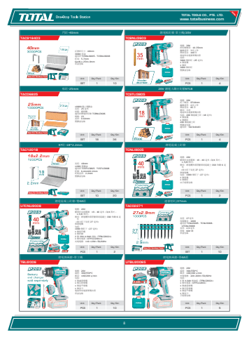 www.totalbusiness.comTOTAL TOOLS CO., PTE. LTD.www.totaltools.cn 01Unit Qty/Pack Qty/CtnPCS 1 5鋰電熱風槍-單4A組UTBLI20065電壓:20V 溫度:300/550°C 風量:100/200 L/min 充電電壓:220-240V~50/60Hz 包括: 1 個 4.0Ah 電池組(TFBLI20021) 1 個充電器(UTFCLI2001) 1 個減速噴嘴 1 個反射噴嘴 1 個扁平噴嘴 1 個刮刀 手提箱包裝Unit Qty/Pack Qty/CtnPCS 1 10鋰電熱風槍-單主機TBLI2006電壓:20V 溫度:300/550°C 風量:100/200 L/min 包括: 1 個減速噴嘴 1 個反射噴嘴 1 個扁平噴嘴 1 個刮刀 電池和充電器單獨出售 彩盒包裝Unit Qty/Pack Qty/CtnSET 1 10連發射釘/27mmTAC02271長度:27 毫米 每箱數量:1000 適用於 TCNLI9005、TCNLI9008、UTCNLI9008 直徑:2.9 毫米 材質:60# 鋼 彩盒包裝Unit Qty/Pack Qty/CtnPCS 1 2鋰電混凝土釘槍-雙4A組UTCNLI9008電壓:20V 緊固件長度範圍:19 - 40 毫米(3/4 英吋 - 1-5/8 英吋) 應用:將電纜和導管緊固到混凝土 C60 和鋼 6 毫米 (最大釘子長度 27 毫米) 無刷電機 包括: 1000 個釘子(27 毫米) 1 個氣門嘴 1 個針腳 2 個 20V 4.0AH 電池(TFBLI20021) 1 個充電器(UTFCLI20411) 充電電壓:110-120V~50/60Hz Unit Qty/Pack Qty/CtnPCS 1 2鋰電混凝土釘槍TCNLI9005電壓:20V 緊固件長度範圍:19 - 40 毫米(3/4 英吋 - 1-5/8 英吋) 應用:將電纜和導管緊固到混凝土 C60 和鋼 6 毫米 (最大釘子長度 27 毫米) 無刷電機 包括:1000 個釘子(27 毫米) 1 個氣嘴 1 個銷釘 由手提箱包裝Unit Qty/Pack Qty/CtnSET 10 20ST釘-18*2.2mmTAC12018長度:18mm 1200/ 塑膠盒 適用於 TCSTLI3805、TCSTLI3808 釘頭:6.4mmX2.2mm 釘柄直徑:2.2mm 塑膠盒包裝Unit Qty/Pack Qty/CtnPCS 1 420V 鋰電大鋼牙釘槍ST18TCSTLI3805電壓:20V 釘子類型:ST18mm 驅動速率:2 釘 / 秒 彈匣容量:65 件 應用:木材 電池和充電器單獨出售 包括:200 顆混凝土釘(18 毫米) 1 個氣嘴 1 個銷釘 200 顆混凝土釘 塑膠盒包裝 適用於:TAC918183Unit Qty/Pack Qty/CtnSET 18 36蚊釘-25mmTAC0682510000 個 / 塑膠盒 長度:25 毫米 材質:鍍鋅鋼 適用於鋰電針釘槍 TCBNLI3606 規格:23 直徑:0.64mm 塑膠盒包裝Unit Qty/Pack Qty/CtnPCS 1 4鋰電蚊釘槍 單主機/20VTCBNLI3603電壓:20V 針釘槍類型:10-35mm 驅動速率:3 釘 / 秒 彈匣容量:140 件 電池和充電器單獨出售 包括: 3600 個針釘(25 毫米) 1 個氣嘴 1 個針 3600 個針釘 塑膠盒包裝Unit Qty/Pack Qty/CtnSET 1 10門釘-40mmTAC918403訂書針尺寸:40mm 3000/ 彩盒 適用於 TCSNLI6005、TCSNLI6008 釘冠:5.7mm Ga18,1.25X1.0mm 彩盒包裝8