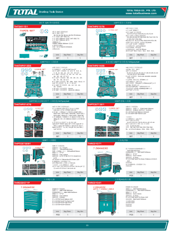 www.totalbusiness.comTOTAL TOOLS CO., PTE. LTD.www.totaltools.cn 01Unit Qty/Pack Qty/CtnPCS 1 1工具櫃/4抽與大櫃THRC01041附輪櫃 附 4 個抽屜 整體尺寸:765*465*812mm 附腳輪整體尺寸:765*465*976mm 腳輪尺寸:5\櫃體厚度:0.8-1.0mm 抽屜厚度:0.7mm 附 4 個 536*410*74.5mm 抽屜 面板面積:560*420*395mm 中央鎖定係統 滾珠軸承抽屜 防震保護 托盤包裝Unit Qty/Pack Qty/CtnPCS 1 1工具櫃/七抽THRC02071P附輪櫃 附 7 個抽屜 整體尺寸:680*458*802mm 附腳輪整體尺寸:680*458*945mm 腳輪尺寸:5\櫃體厚度:0.6-0.8mm 抽屜厚度:0.6mm 附 1 個 570*410*48mm 抽屜 附 3 個 570*410*74.5mm 抽屜 附 2 個 570*410*100.5mm 附 1 個 570*410*153mmUnit Qty/Pack Qty/CtnPCS 1 1工具車/7抽THRC01071附 7 個抽屜的滾輪櫃整體尺寸:765*465*812mm 附腳輪整體尺寸:765*465*976mm 腳輪尺寸:5\櫃體厚度:0.8-1.0mm 抽屜厚度:0.7mm 帶 5 個 536*410*74.5mm 536mm 滾珠軸承抽屜 防震保護 附 5 個鐵掛鉤(用於懸掛工具) 托盤包裝Unit Qty/Pack Qty/CtnSET 1 1328件工具櫃組THPTCS73281 328 件工具箱套裝 箱體部分:附 7 個抽屜 整體尺寸:765x465x812mm 整體(含腳輪)尺寸:765x465x976mm 腳輪尺寸:5\櫃體厚度:0.8-1.0mm 抽屜厚度:0.75 帶 50.75 帶 5 個抽屜厚度:0.75 15 個抽屜 0. 536x410x153.5mm 抽屜 5 個鐵掛鉤(用於懸掛工具) 採用 EVA 泡棉 + 紙箱 + 托盤包裝 工具零件:1 件 棘輪扳手:1/4\13 件 1/4\筒 4-4.5-5-5.5-6-7-8-9-10-12 Unit Qty/Pack Qty/CtnSET 1 1132件套裝工具箱THPTCS71321 132 件工具箱套裝 箱體部分:整體尺寸:520*218*320mm 櫃體厚度:0.8mm 抽屜厚度:0.6mm 附 1 個 510*210*60mm 頂部抽屜 附 3 個 449*196*54mm 抽屜 工具零件: 1 件棘輪扳手:1/4 英吋 13 件 1/4 英吋套筒4-4.5-5-5.5-6-7-8-9-10-11-12-13-14 24 件 1/4 英吋 x 32(長)位 套筒:六角:3-4-5-6-mm 星形:T8-T10-T15-T20-T25-T30-T40 SL:4-5.5-6.5-8mm、PH1、PH2、PH3、Unit Qty/Pack Qty/CtnSET 1 1147件鋁合金箱拉桿手工具組套/147pcs/setTHKTHP21476 147 件手動工具套裝包括; 把 7 吋鋼絲鉗 (CR-V)) 1 把 6 吋尖嘴鉗(CR-V)) 1 把 6 吋斜嘴鉗 (CR-V) 4 把 S2 一字螺絲起子 ( 雙色柄 ):SL8*150 / SL6*125 / SL5*100 / SL6150 / SL6*125 / SL5*100 / SL63.5* / PH1*100 / PH2*38 1 把 200mm 半圓鋼銼 1 把 40cm 水準儀 1 個300g 機工錘 1 個 300mm 鋼鋸架 1 個 5M 鋼捲尺 1 套 9 把 內六角扳手 1. 6 / 8 / 10 1pcs 8.5\動扳手 1pcs 10\9pcs 兩用扳手:6 / 8 / 10 /pc 12 /10 191 / 1/4\Unit Qty/Pack Qty/CtnSET 1 12-3-4分142件綜合組套/142pcs/setTHKTHP21426 142 件組合工具套裝包括: 1/2\1/2\8-10-12-13-14-15-16-17-18-19-20-21-22-23-24-25-27-30-32MM 5 1/2\1010 120 1 1/2\1/2\1/2\1/2\1/2\火花塞套筒 1/2\1/2\Unit Qty/Pack Qty/CtnSET 1 1135件綜合工具組套THKTHP21356 135 件組合工具組包括: 3 件棘輪扳手:1/4\13 件 1/4\7、8、9、10、11、12、13、14 毫米 9 件 3/8\14、15、16、17 毫米 9 件 1/2\24、27、30、32 毫米 8 件 3/8\1/4\6 件 3/8\15、17mm 1 個 1/2\2 個 3/8\Unit Qty/Pack Qty/CtnSET 1 1137件組合工具套裝THKTHP21376 137 件組合工具組 1 件 1/4\13 件 1/4\4,4.5,5,5.5,6,7,8,9,10,11,12,13,14 24 件 1/4\H3-H4-H5-H6-H7-H8-H10-T8-T10-T15-T20-T25-T27-T30-T40 SL4-SL 5.5- SL 6.5-PH1-PH2-PH3-PZ1-P6 1/Z3\1 件 1/4\1 件旋轉手柄:1/4\1 個 1/4\1 個批頭套筒:1/4\20 個 1/4\Unit Qty/Pack Qty/CtnSET 1 115 件 3/4 英吋套筒組THT34115115 件 3/4\10 件 3/4\30-32-34-36-38-41-46-50-55-60mm 1 件 13/4\1 件 3/4\1 件 3/4\1000/41 件10000 10000 200mm 延長桿1 個重型金屬盒材質:Cr-V 熱處理冷擠壓鍍鉻金屬盒包裝89